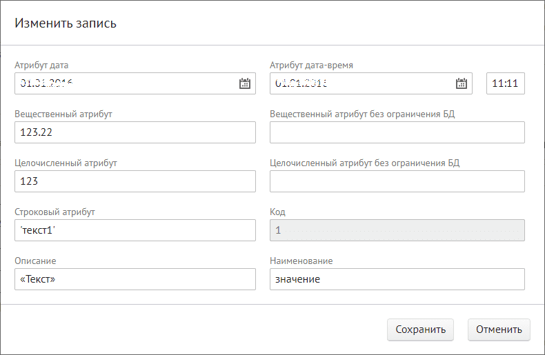 Ошибка при попытке создания или изменения записи внутреннего справочника (действие выполняется бизнес-администратором с правом редактирования или системным администратором справочников):
