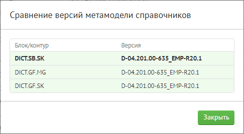 В открывшейся форме «Сравнение версий метамодели справочников» отобразятся идентификаторы версии метамодели справочников в различных блоках/контурах.