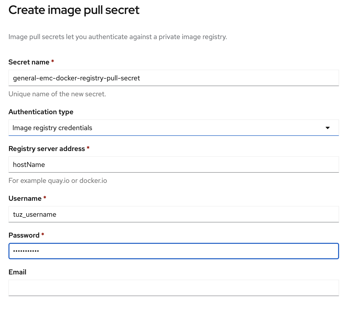 Добавить в среду оркестрации манифест secret с типом image pull secret и именем general-emc-docker-registry-pull-secret для хранения учетных данных ТУЗ для скачивания образов из Docker хранилища образов.