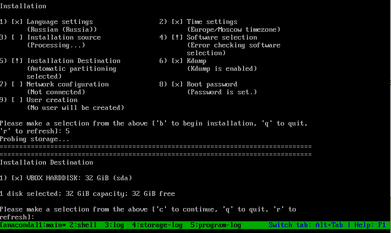 Отсутствует возможность настроить какие-либо расширенные методы хранения (LVM, программный RAID, FCoE, zFCP и iSCSI).
