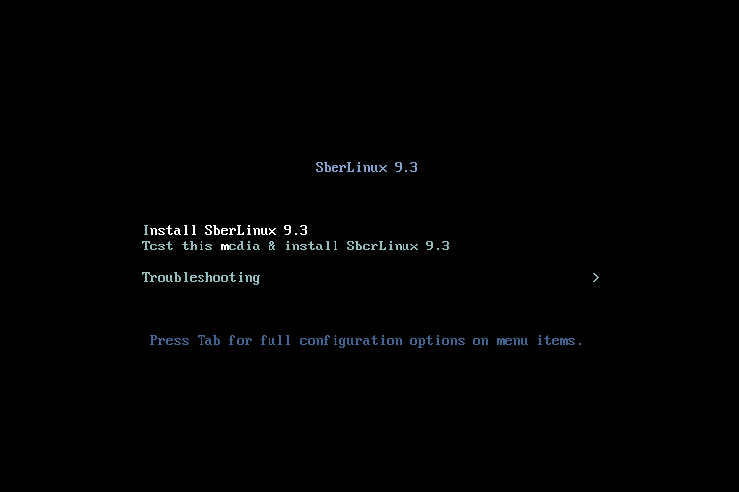 В меню загрузки выберите строку Install SberLinux 9.3 и нажмите клавишу Enter. Надпись Press tab for full configuration options on menu items обозначает, что нажатие клавиши tab поможет настраивать параметры в пунктах меню.