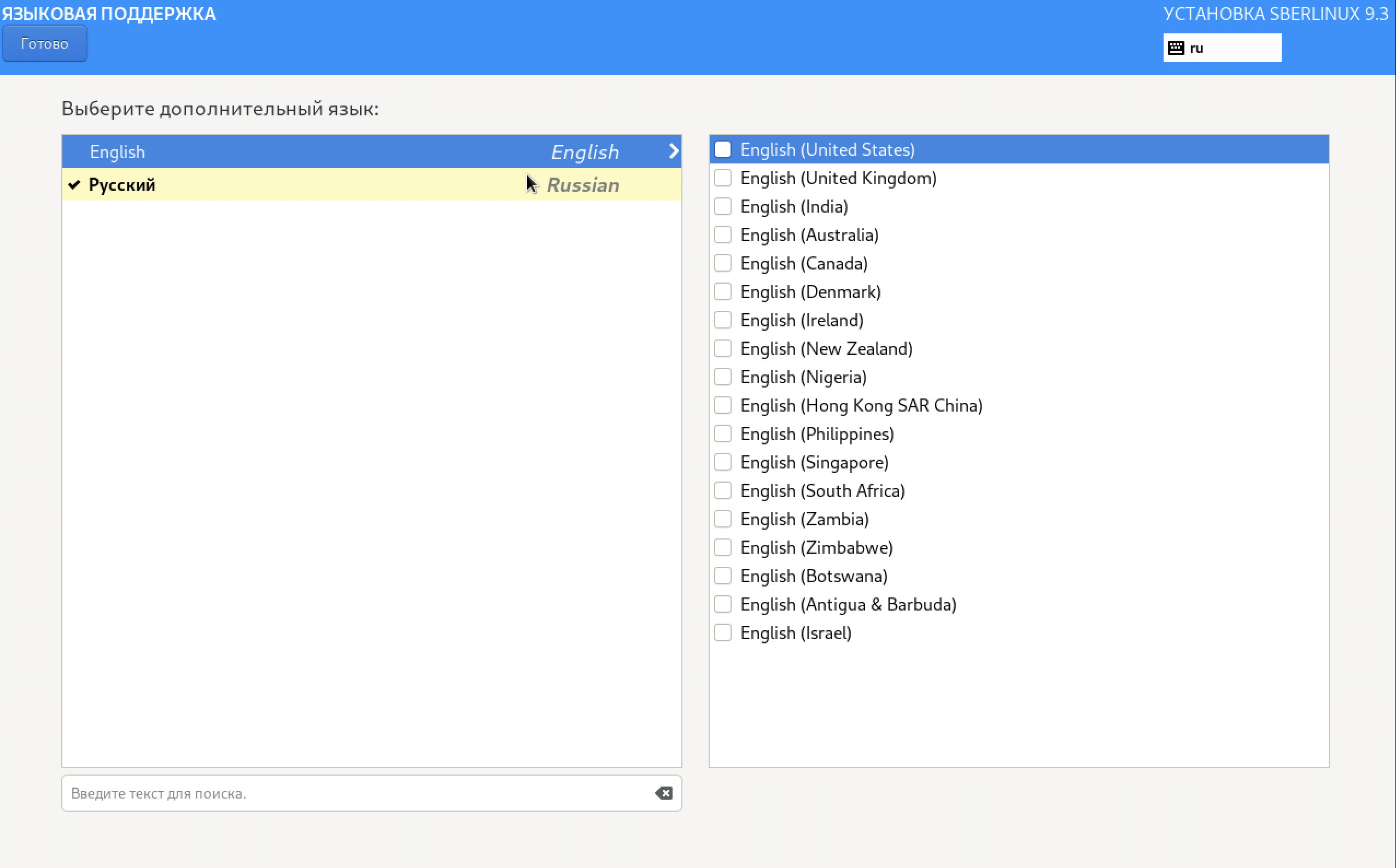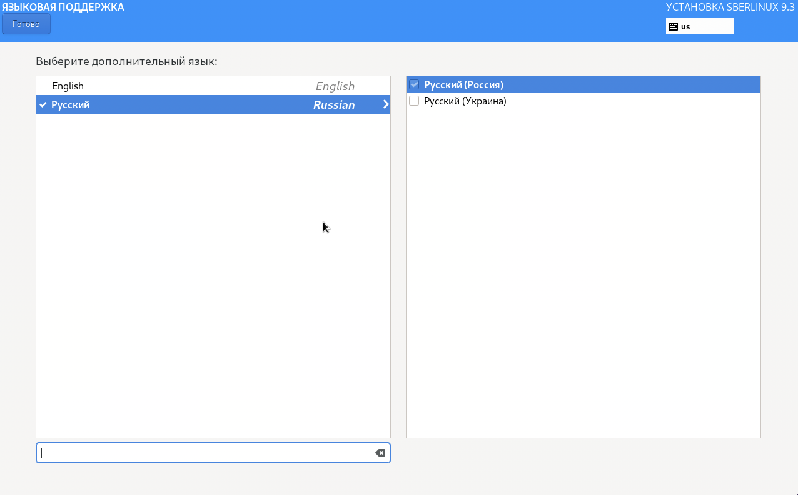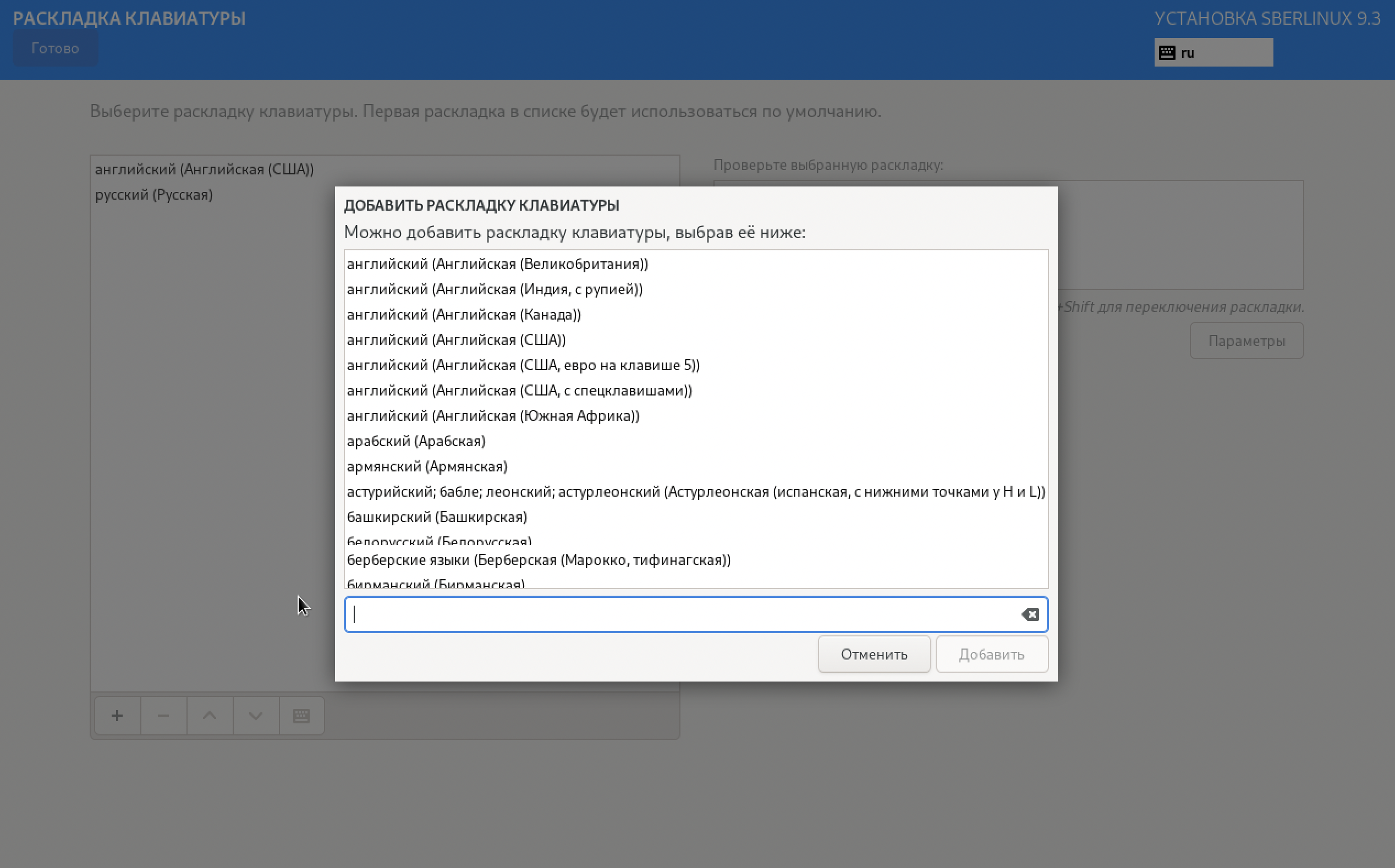 Языковая поддержка по умолчанию зависит от параметра, выбранного при установке SberLinux с использованием Anaconda. Если выбранная раскладка не использует латиницу, а использует только кириллицу, рекомендуется дополнительно добавить английскую раскладку и настроить комбинацию клавиш для переключения. В противном случае вы не сможете авторизоваться в системе после завершения установки.