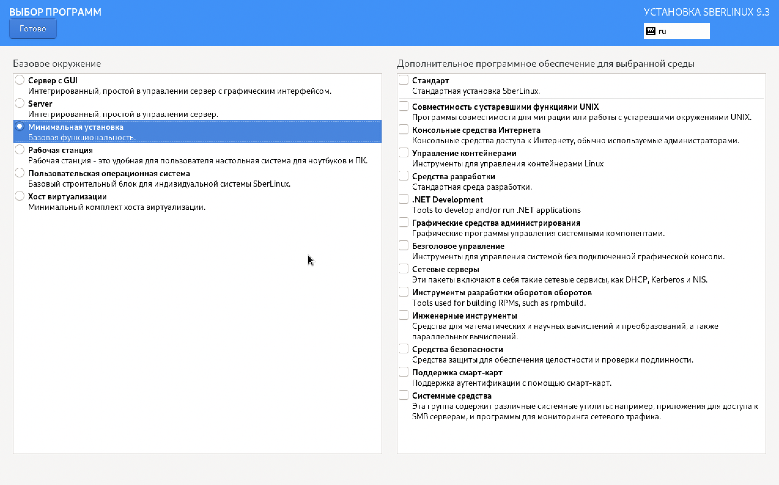 Стандарт – стандартная установка SberLinux с дополнительными пакетами.