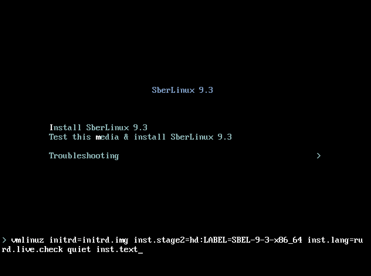 Test this media & install SberLinux 9.3 - для проверки целостности установочного носителя. В процессе загрузки проверяется носитель и выявляются любые проблемы, после чего стартует стандартная установка с помощью графической программы установки (инструкции приведены в разделе «Графический режим» –> «Установка offline - с использованием «вшитого» в установочный образ репозитория (графический интерфейс и текстовый режим пользователя)» и «Установка online - с указанием URL удаленного репозитория (графический интерфейс и текстовый режим пользователя)»);