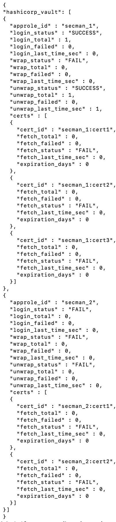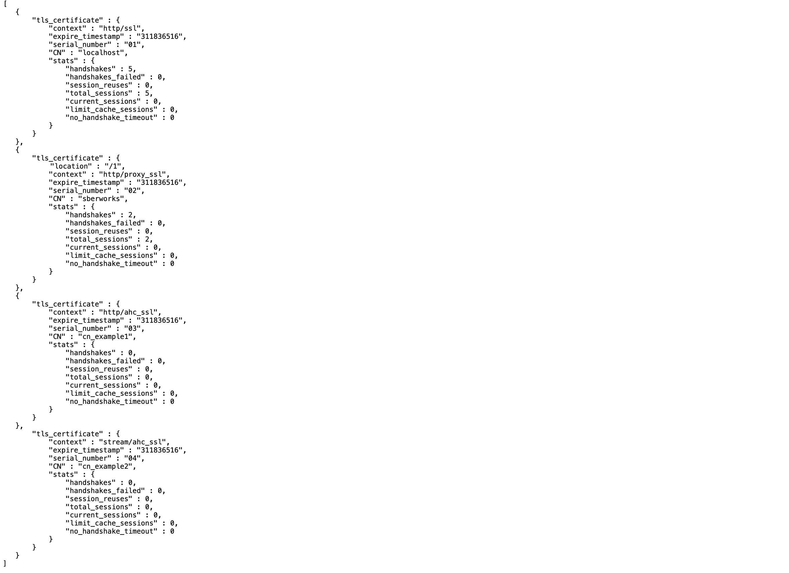 Примечание: Значение параметра expiration_days для сертификата при запросе статистики содержит актуальное значение, если этот сертификат был успешно получен из HashiCorp Vault и он указан в одной из соответствующих директив (например, ssl_certificate или других). Если полученный из HashiCorp Vault сертификат не используется в работе SynGX, значение „expiration_days“ для этого сертификата при запросе статистики будет равно 0.