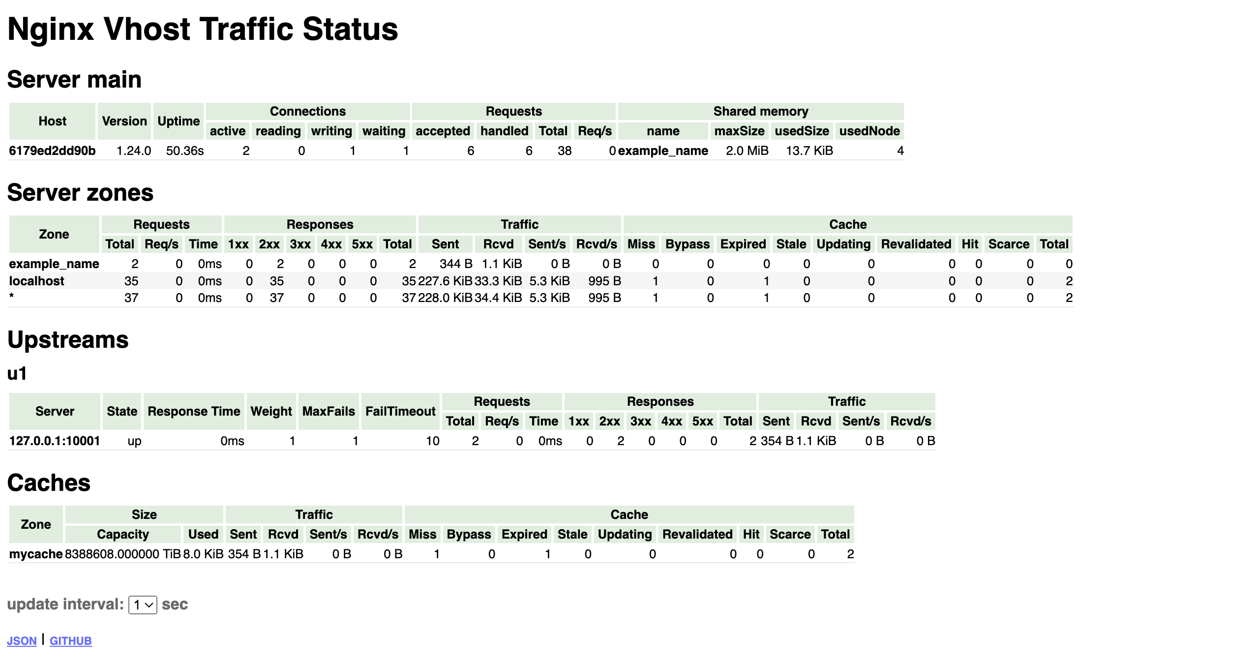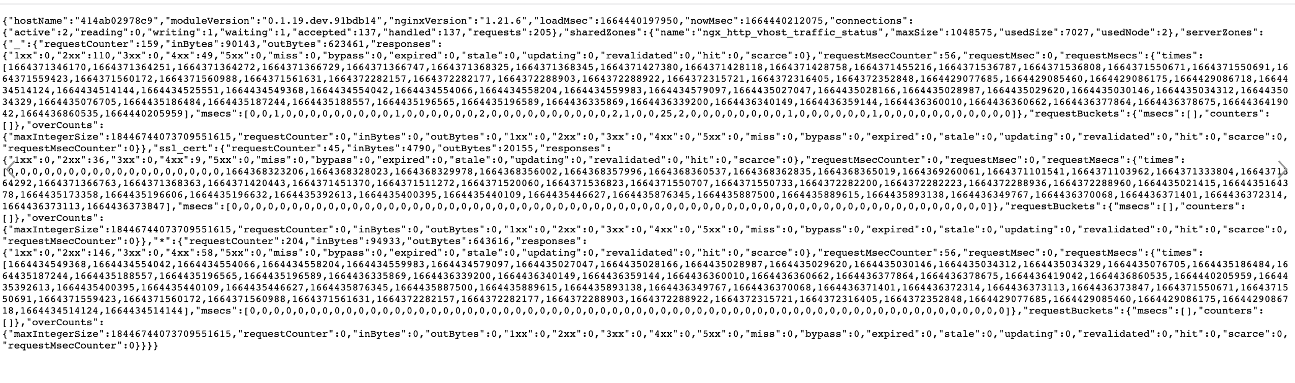 Данный модуль предоставляет возможность получения статистики по запросам в разрезе виртуальных серверов в формате html-страницы, а также можно настроить выдачу в форматах json и prometheus. Помимо этого, рассматриваемый модуль может выдавать статистику по использованию кеша для статистического содержимого в форматах json и prometheus. Модуль обеспечивает предоставление следующих видов метрик: