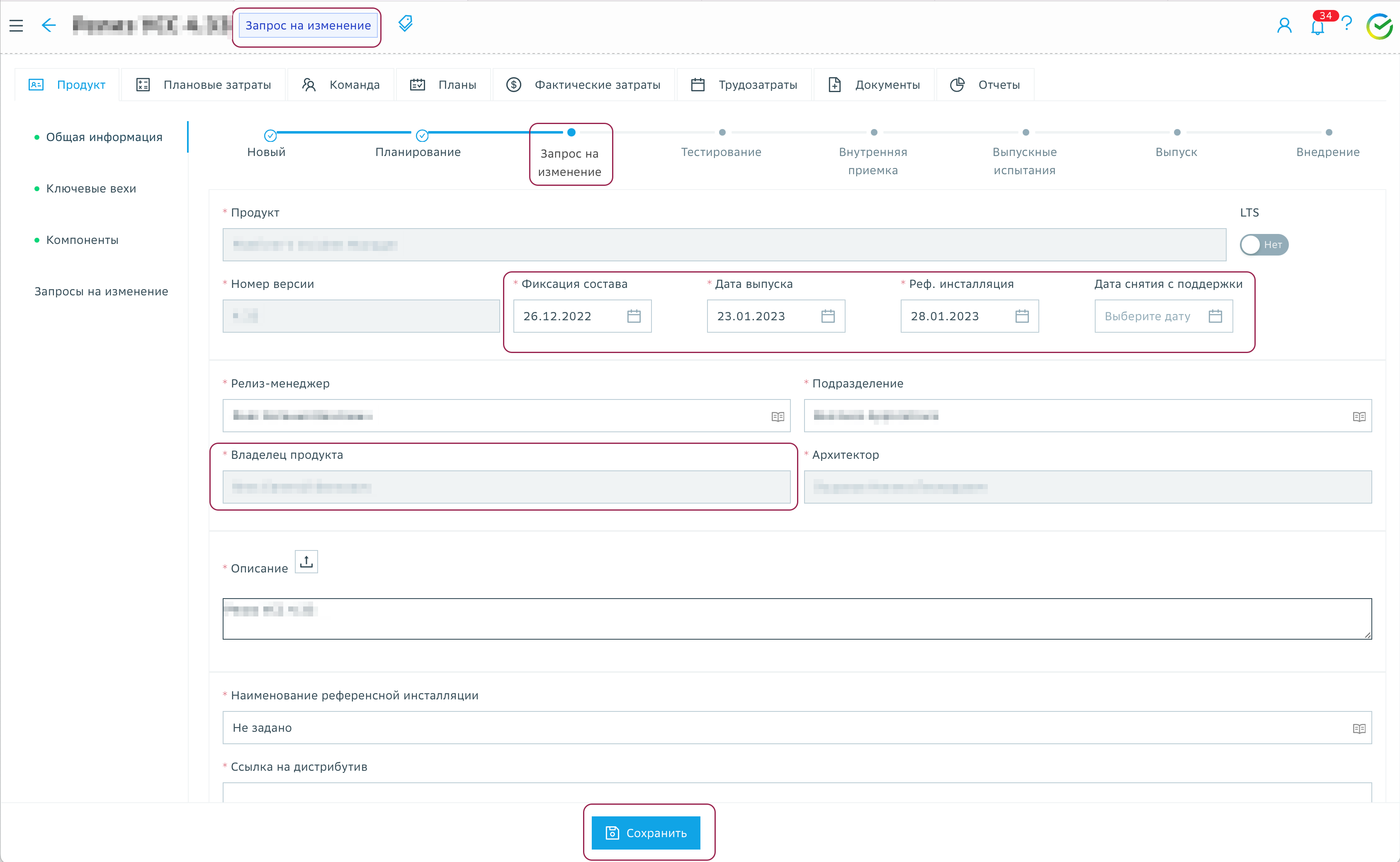 При внесении изменений в дату фиксации состава версии продукта (или в дату начала реализации для проекта) будет заблокирована возможность сохранения базового плана. Операции изменения даты начала и сохранения базового плана необходимо проводить в разных запросах на изменение.