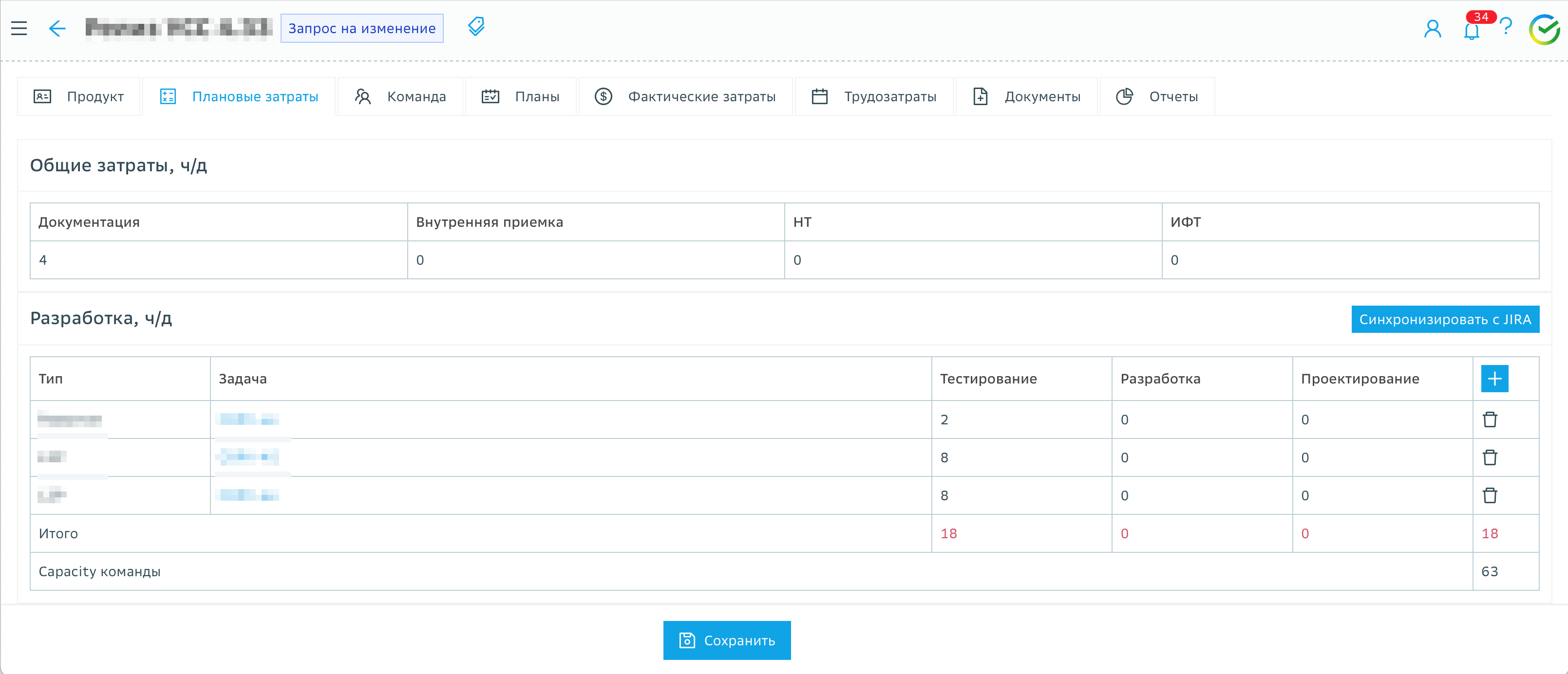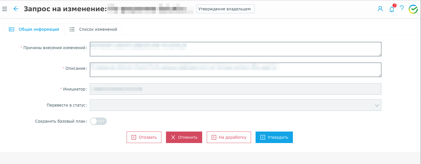 Руководитель проекта, находящегося на этапе «Планирование» или «Реализация», для внесения изменений в заблокированных на предыдущих этапах разделах карточки проекта создает ЗНИ.
