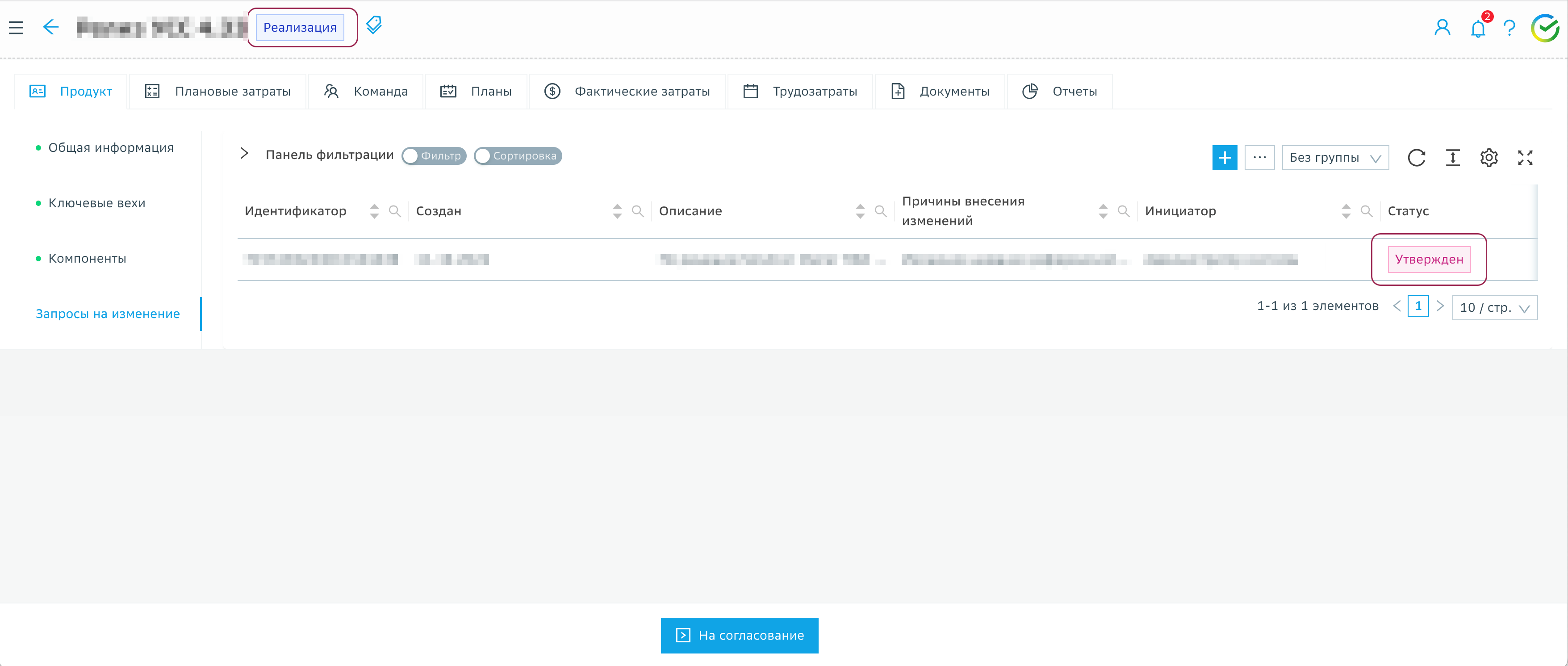 На вкладке Список изменений в карточке Запроса на изменение ВП/МР просматривает все внесенные в карточку Версии продукта Изменения и нажимает кнопку На согласование (дальнейшая работа с карточкой Версии продукта до завершения процесса согласования возможна только в режиме просмотра).