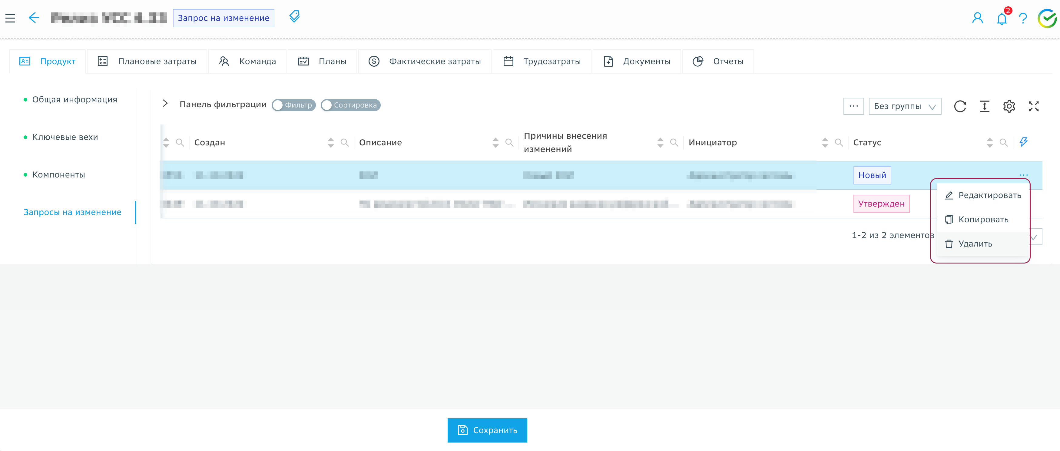 Все изменения в рамках Запроса на изменение не сохраняются сразу непосредственно в карточке версии, они хранятся отдельно (изменения не видны в списочных представлениях). Только после утверждения запроса на изменение они сохраняются в основных сущностях версии продукта.