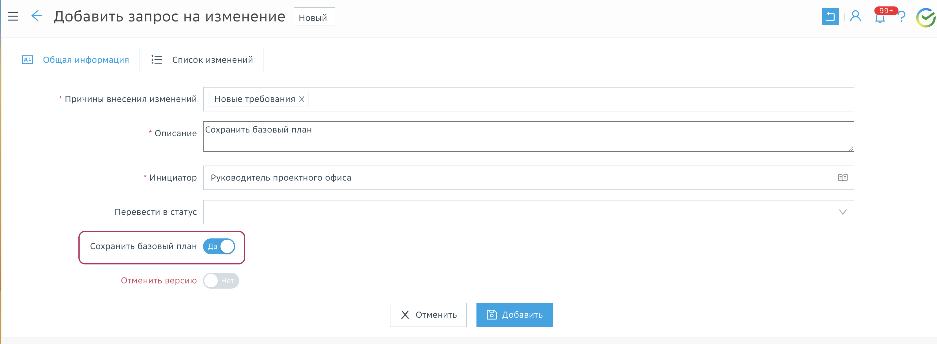 Признак сохранения базового плана (если признак активен, при утверждении запроса на изменение будет сохранен новый базовый план проекта/версии продукта на основании текущего рабочего плана)