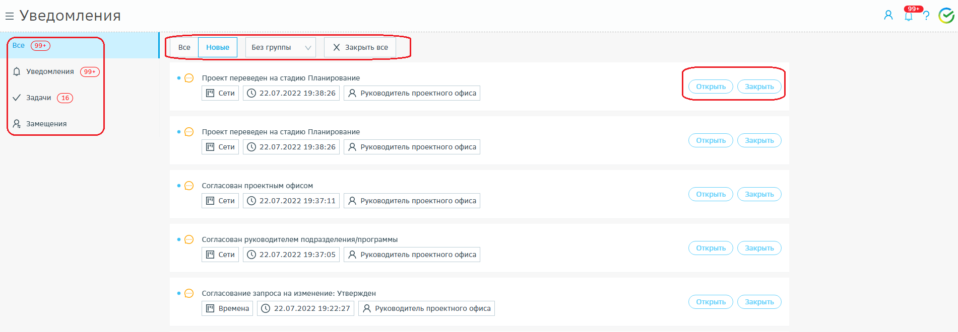 Остальные пользователи видят проекты, в команду которых они входят, и проекты, в состав которых входят замещаемые ими лица.