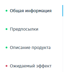 В левой части карточки проекта находятся вкладки разделов карточки, их состав зависит от типа проекта и его текущей стадии. Слева от закладки красная точка указывает на наличие в разделе незаполненных обязательных атрибутов: