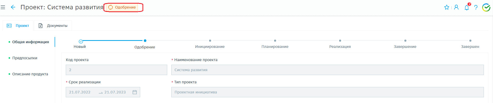 Вверху карточки проекта раздела Общая информация расположена статусная полоса, которая отражает текущий статус. Возможные статусы: