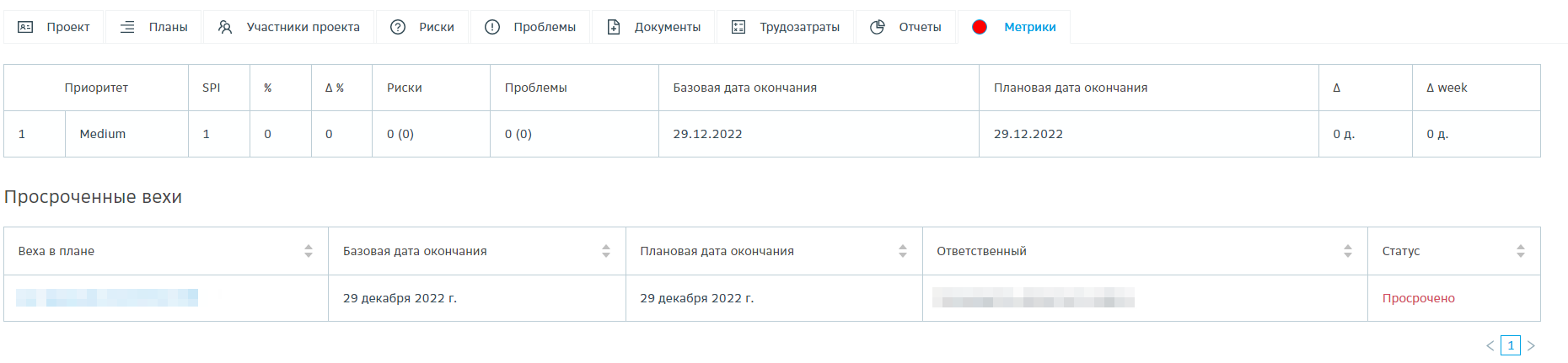 На вкладке Метрики открытой карточки проекта отображается информация, входящая в состав отчета по статусам проектов (см. Отчеты). Цвет иконки-метки на вкладке сигнализирует о состоянии здоровья проекта. Так, для проекта с проблемами отображается красная метка. Открытие вкладки Метрики, предоставляет развернутые сведения: