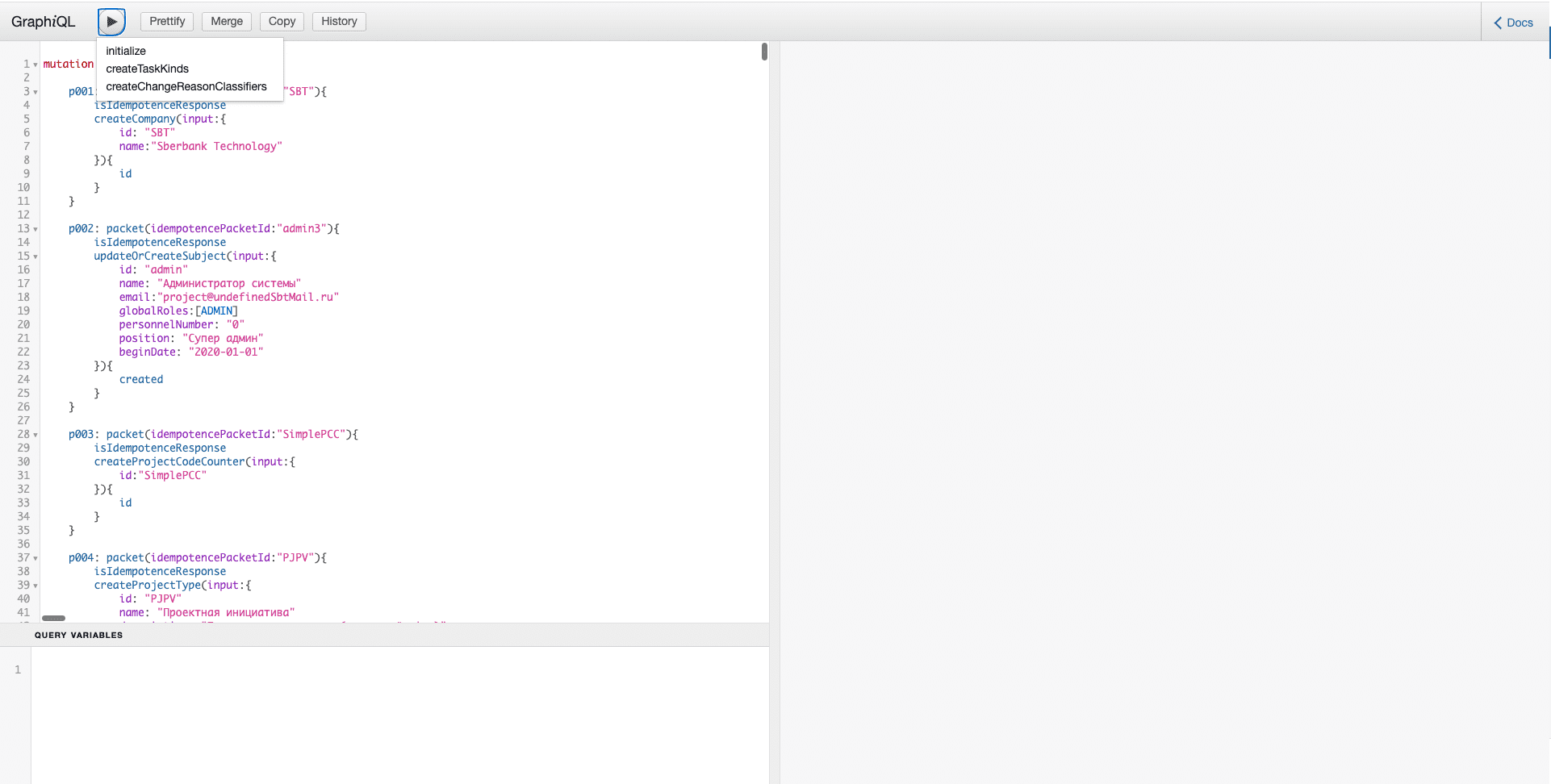 https://{HOST}/sberproject-ds-core-unsecure/graphiql.Для импорта данных в Projects проинициализируйте данные в соответствии со следующим списком: