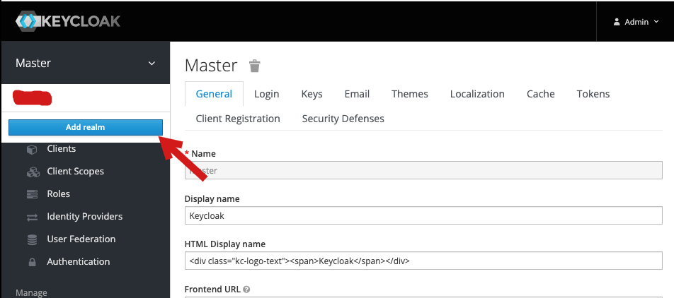 Наведите на наименование Master Realm и нажмите кнопку Add realm: