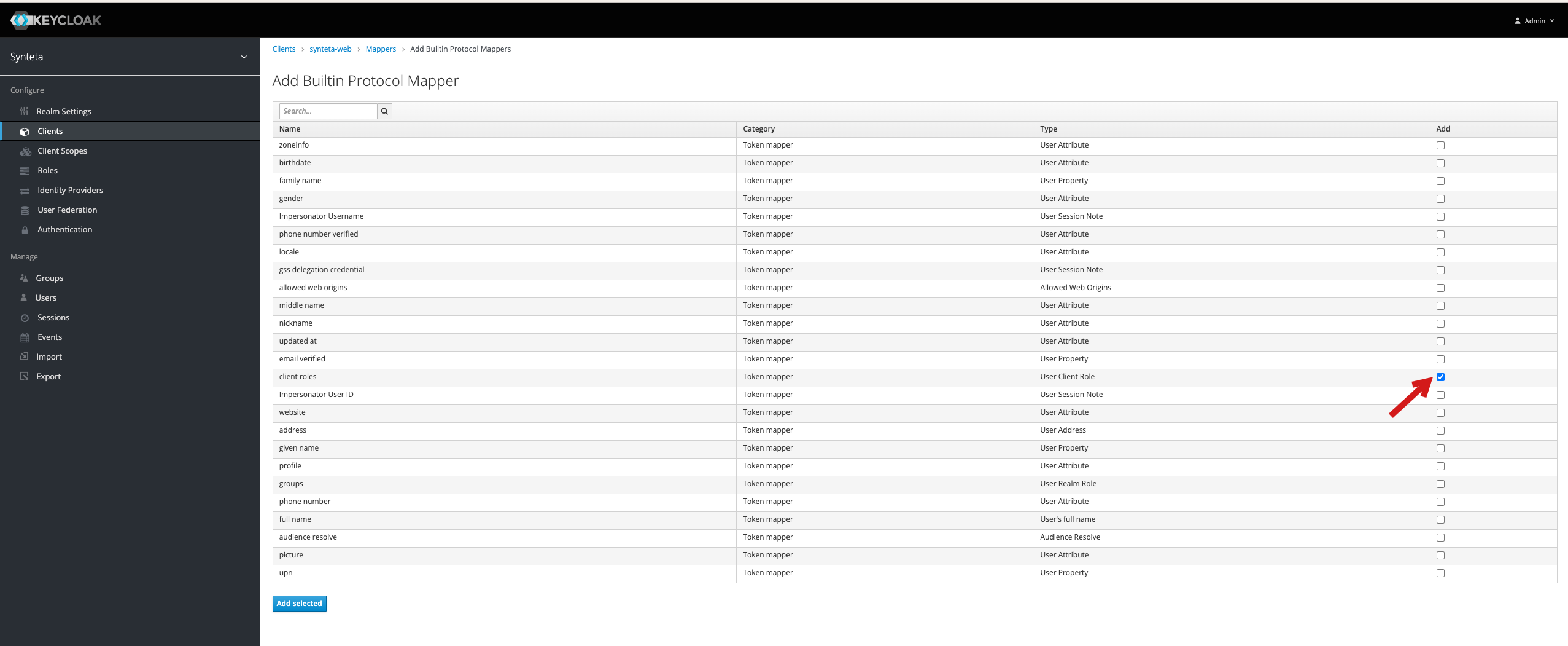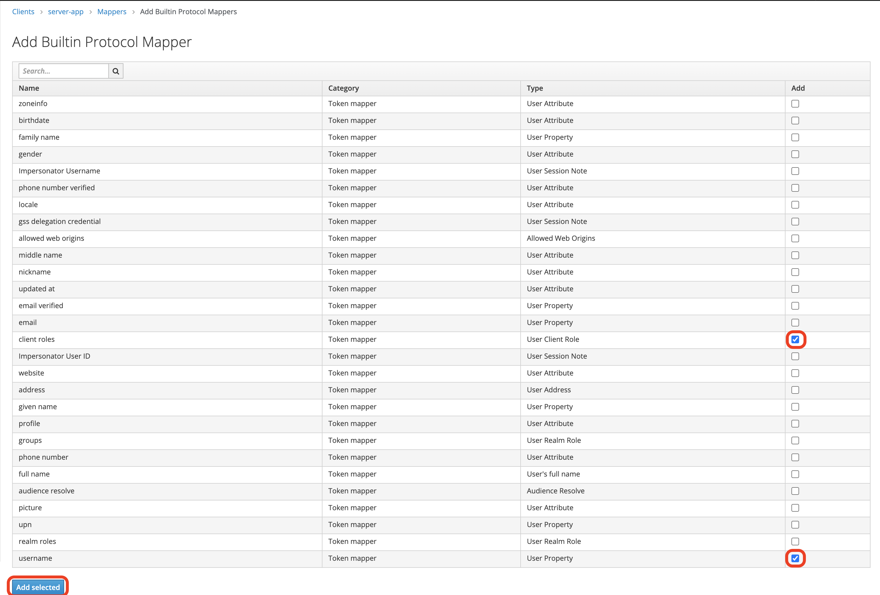 username,client rolesи нажмите кнопку Add selected (Добавить выбранные):