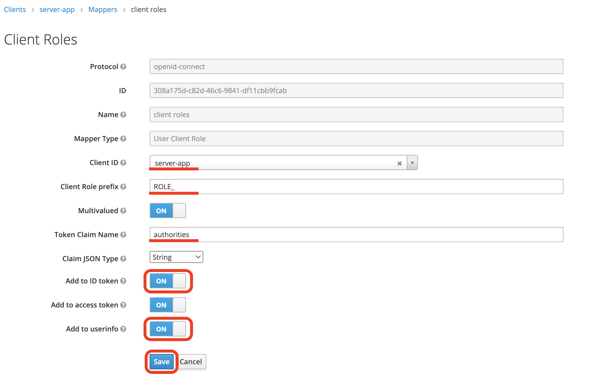 Client Role prefix-ROLE_Token Claim Name-authoritiesAdd to ID token-trueAdd to userinfo-true