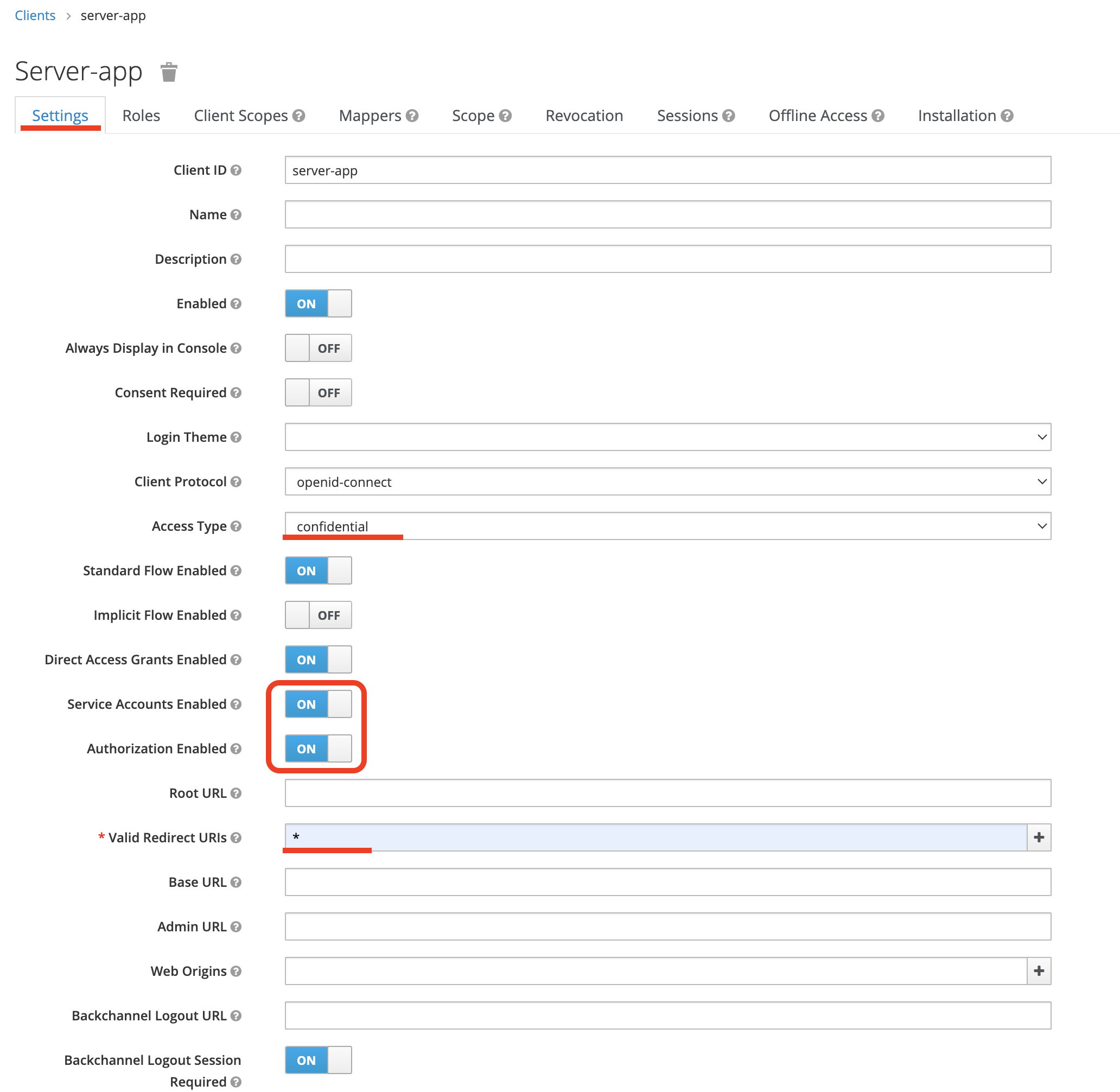 Access Type-confidentialService Accounts Enabled-trueAuthorization Enabled-trueValid Redirect URIs-*