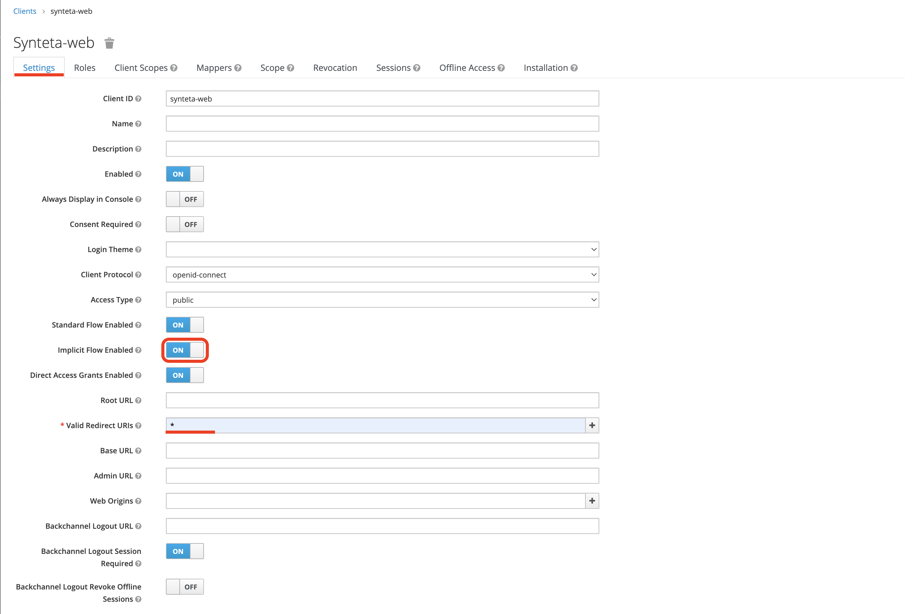 Access Type-publicImplicit Flow Enabled-trueValid Redirect URIs-*