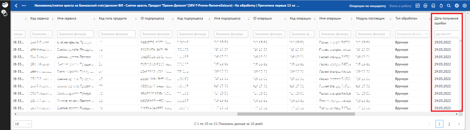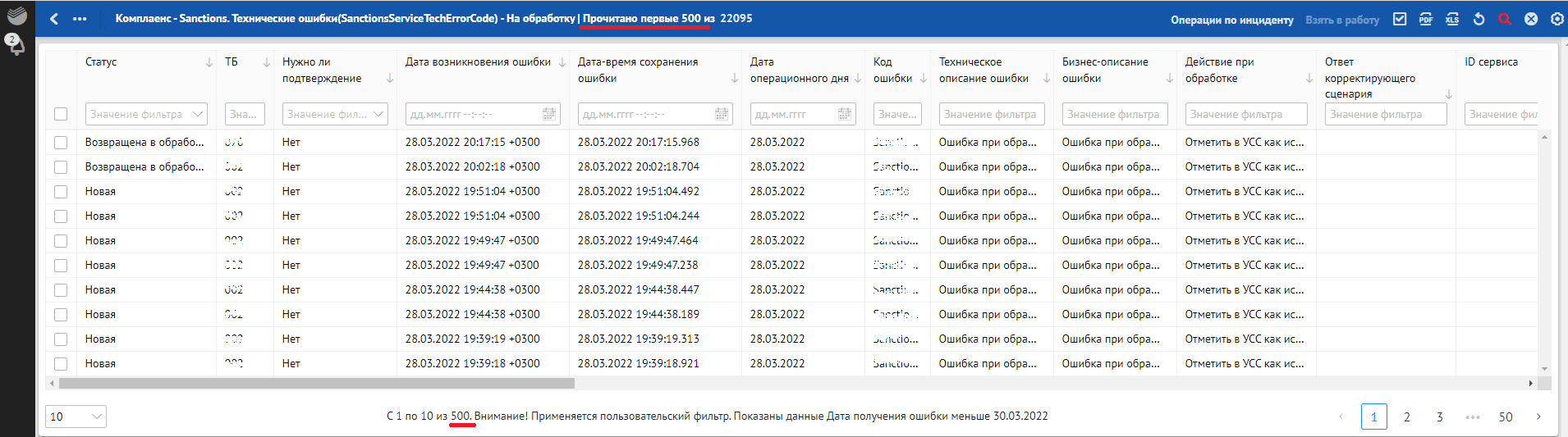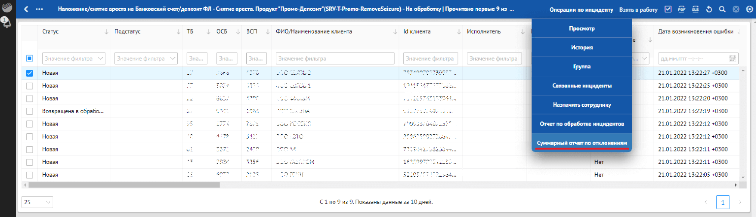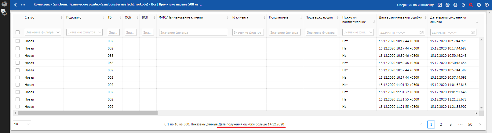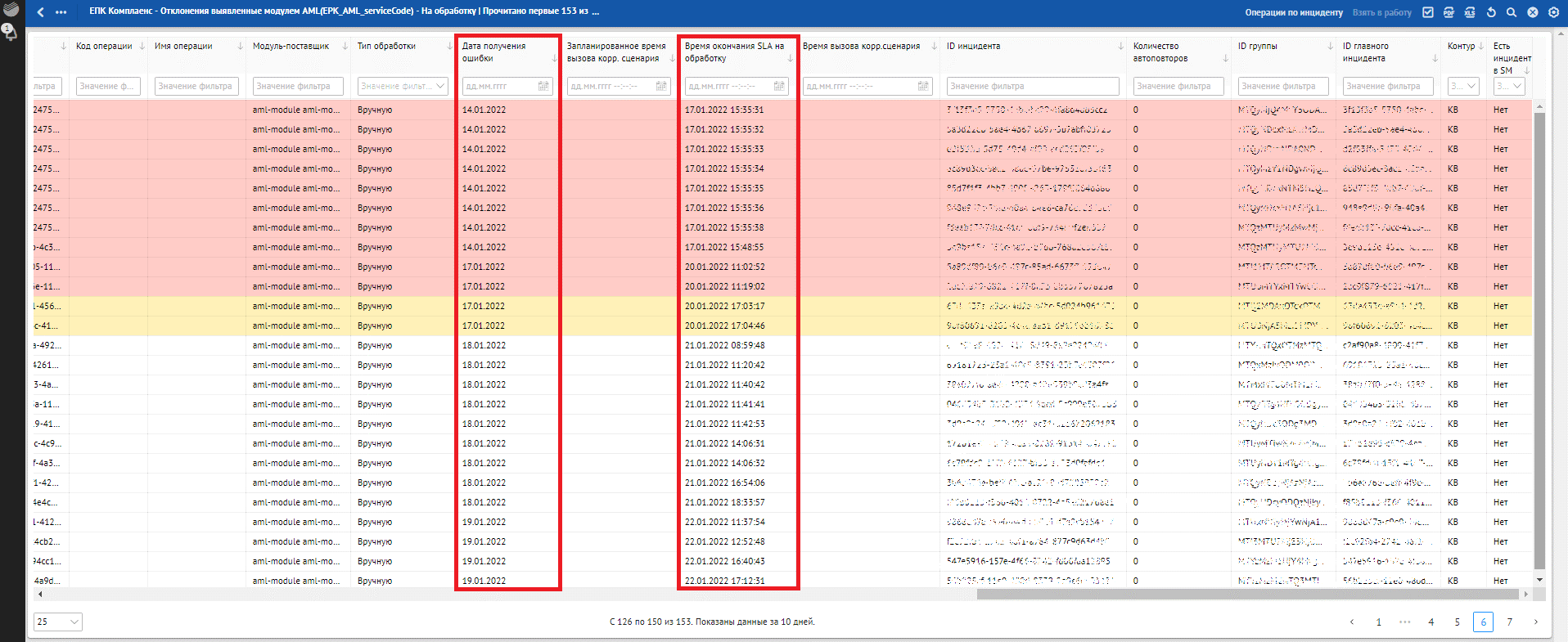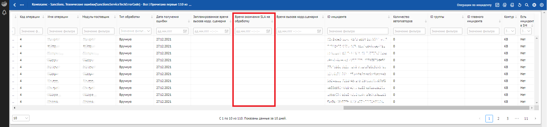 Кроме отклонений, отражающих в себе SLA о времени обработки, красным фоном также подсвечиваются отклонения, по которым произошли следующие ошибки обработки: