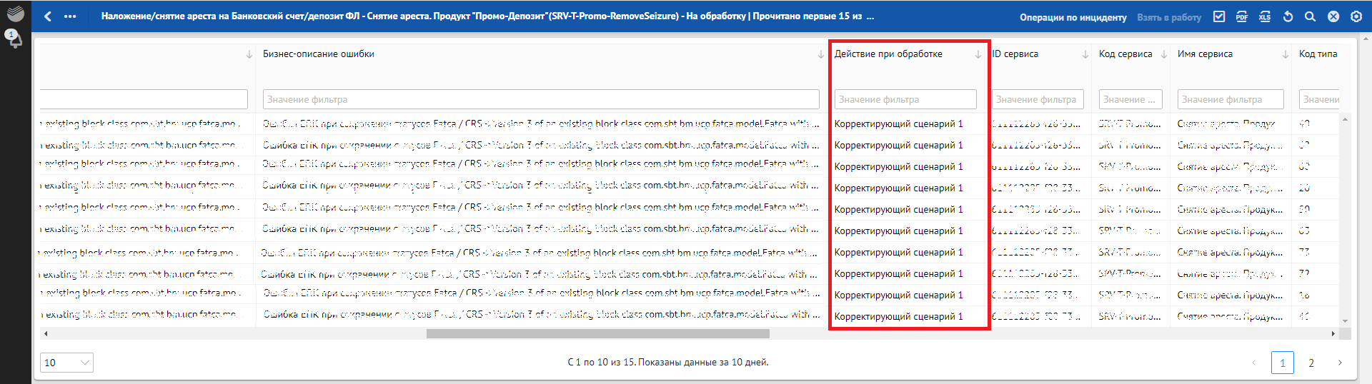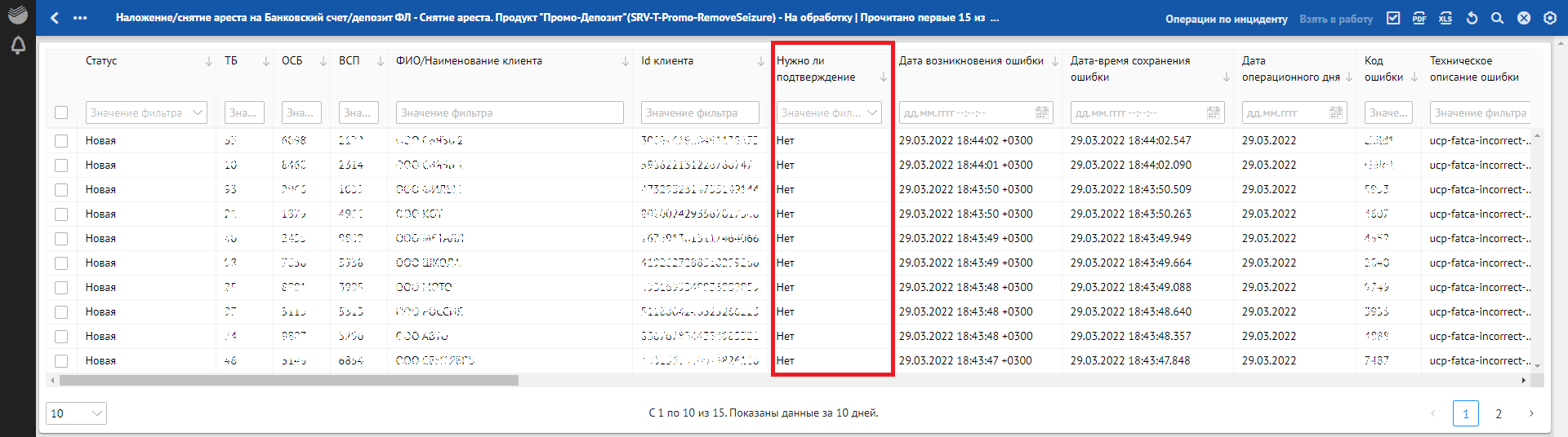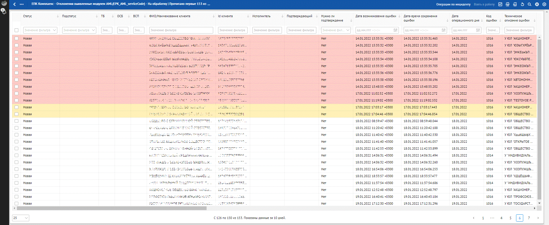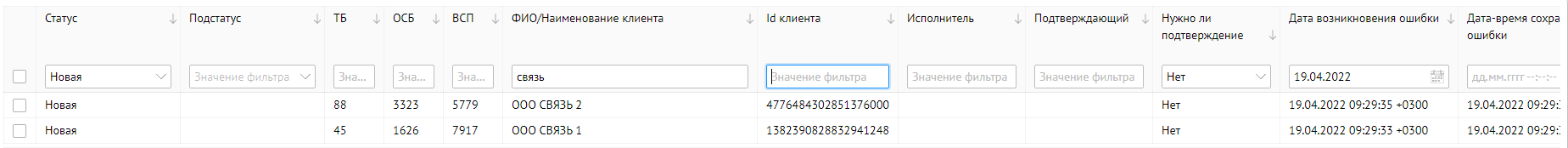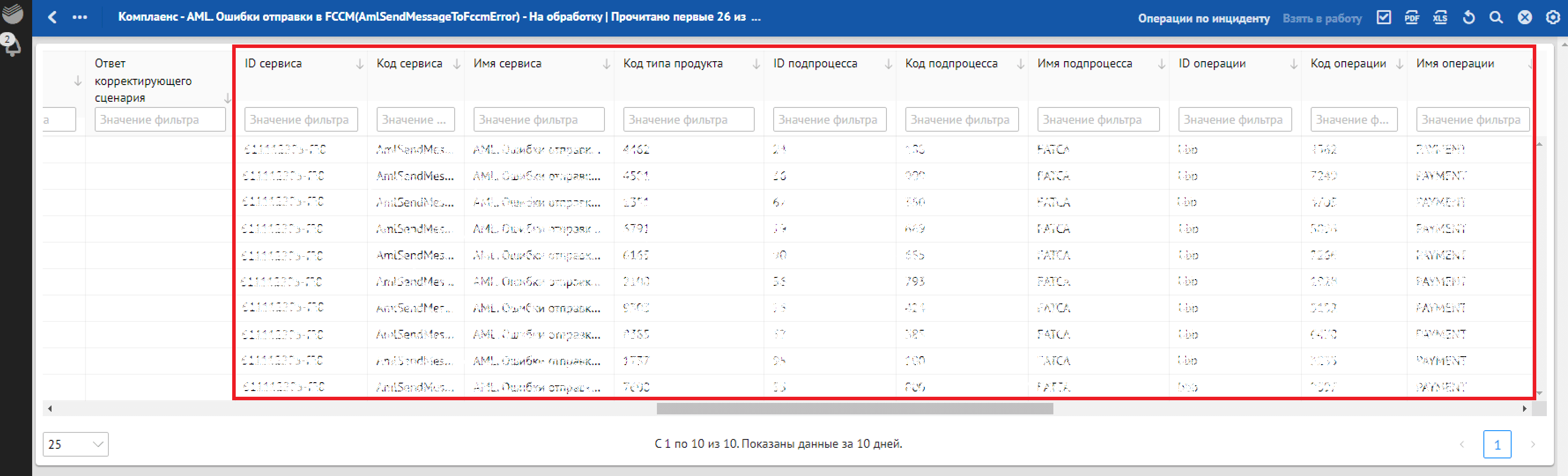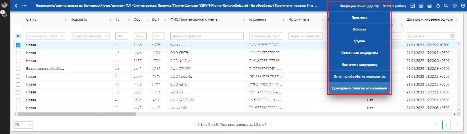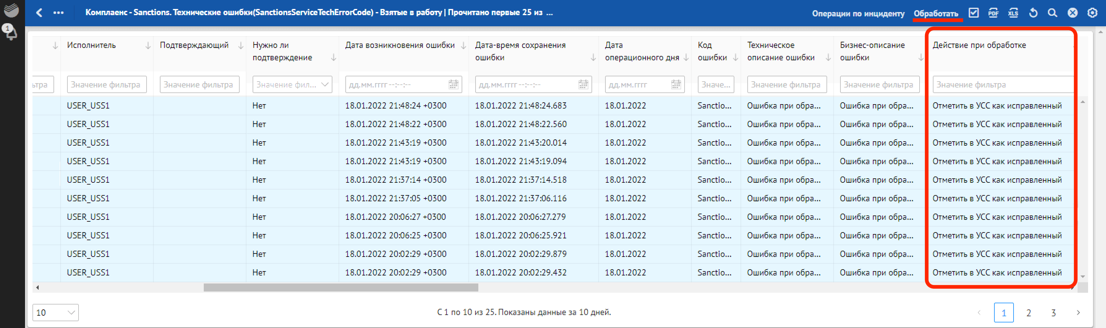 Кроме отклонений, отражающих в себе SLA о времени обработки, красным фоном также подсвечиваются отклонения, по которым произошли следующие ошибки обработки: