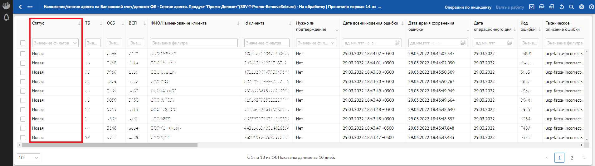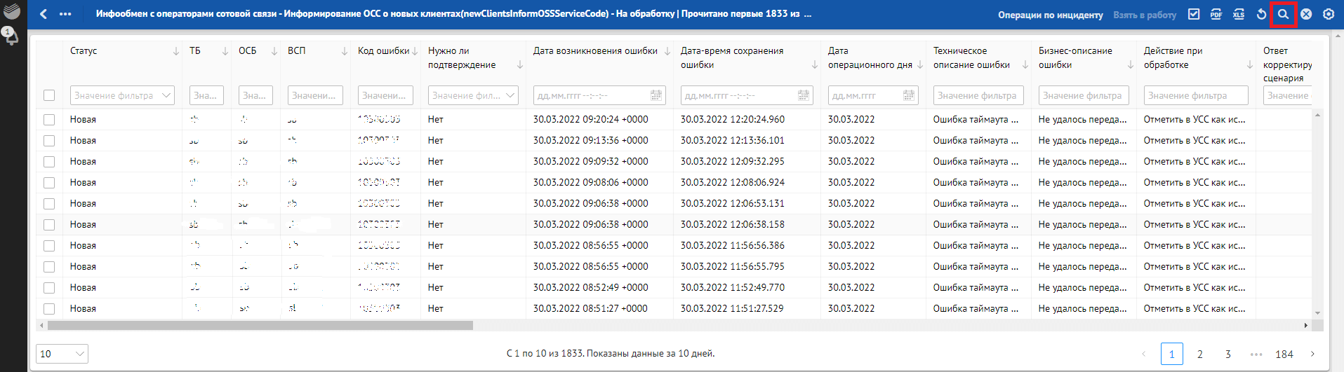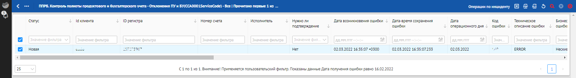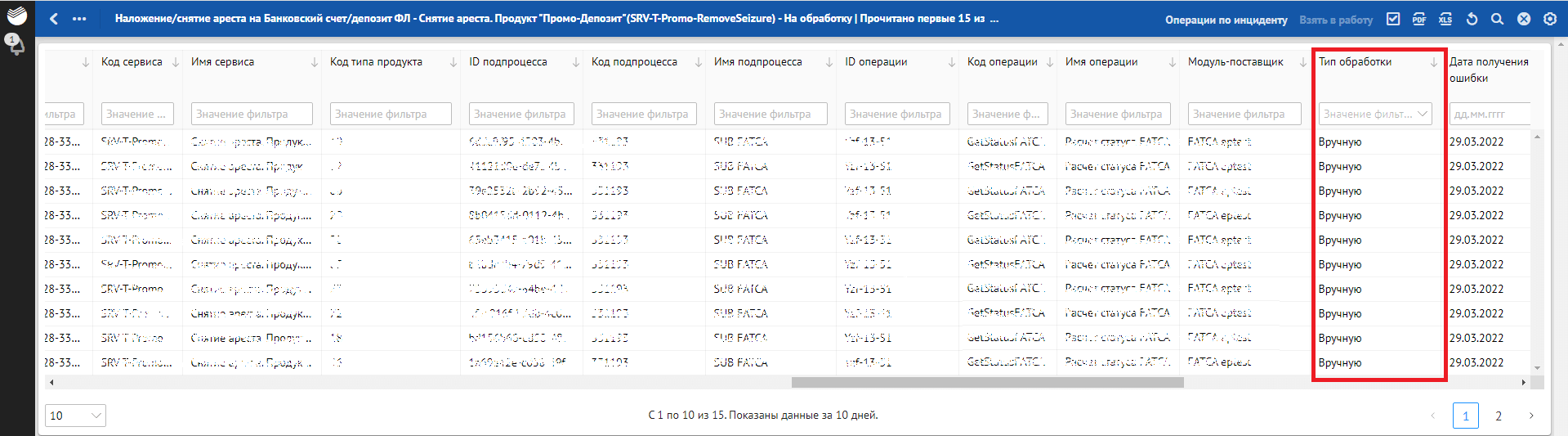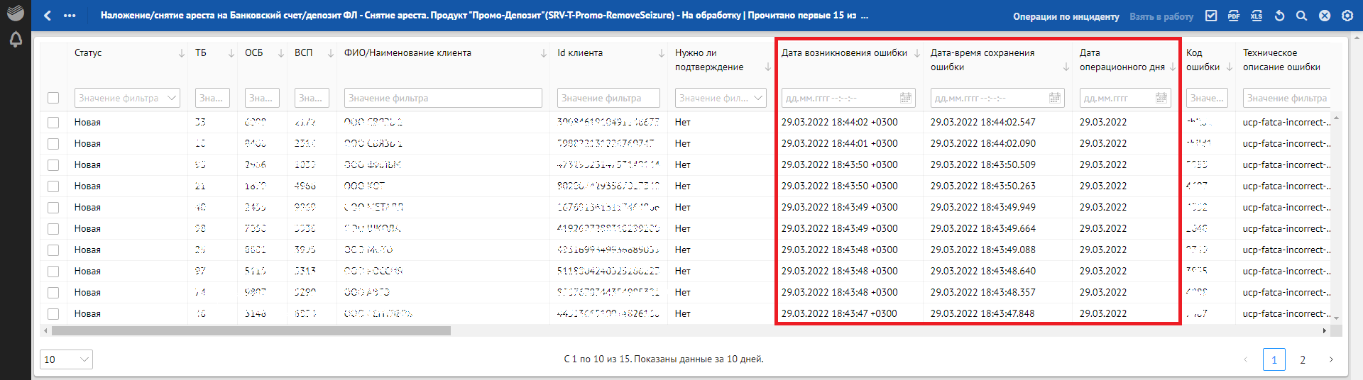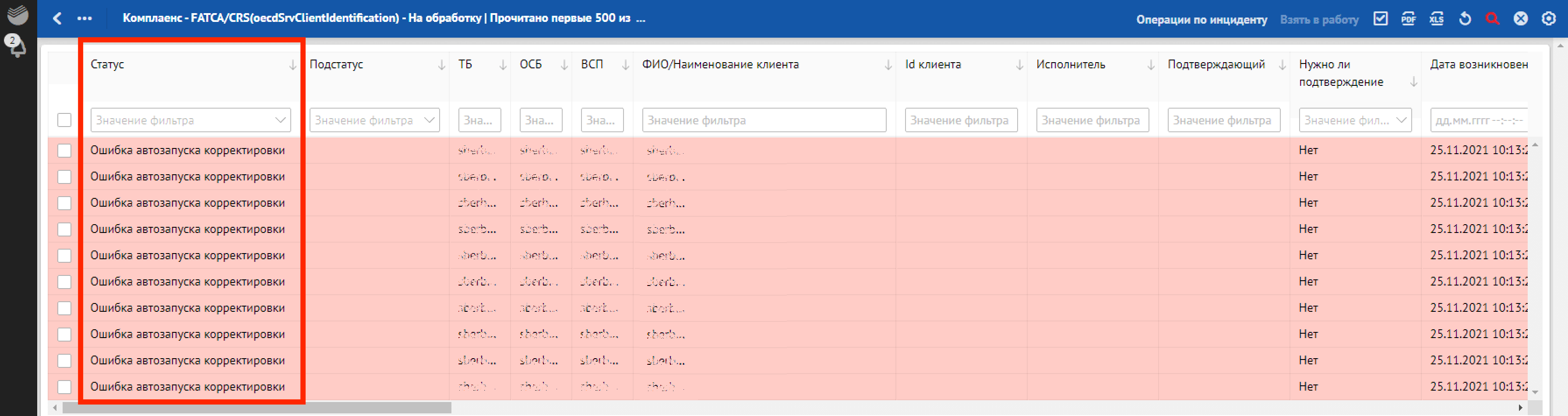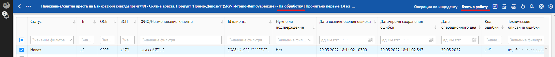 Кроме отклонений, отражающих в себе SLA о времени обработки, красным фоном также подсвечиваются отклонения, по которым произошли следующие ошибки обработки: