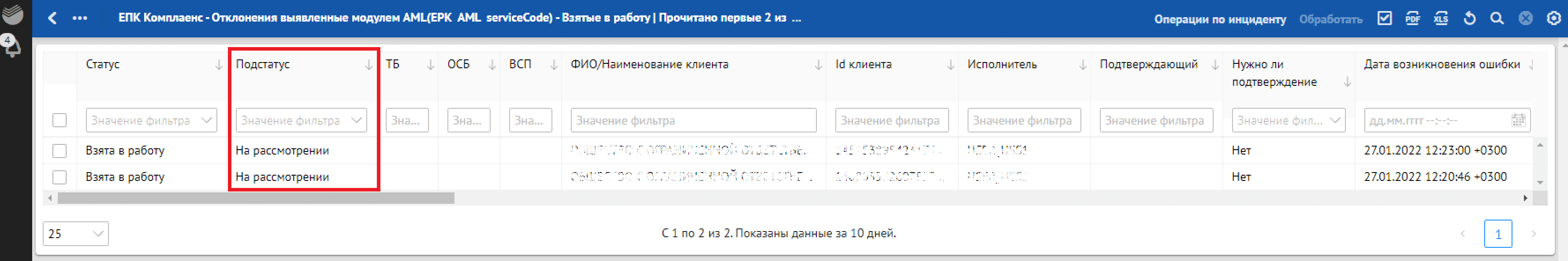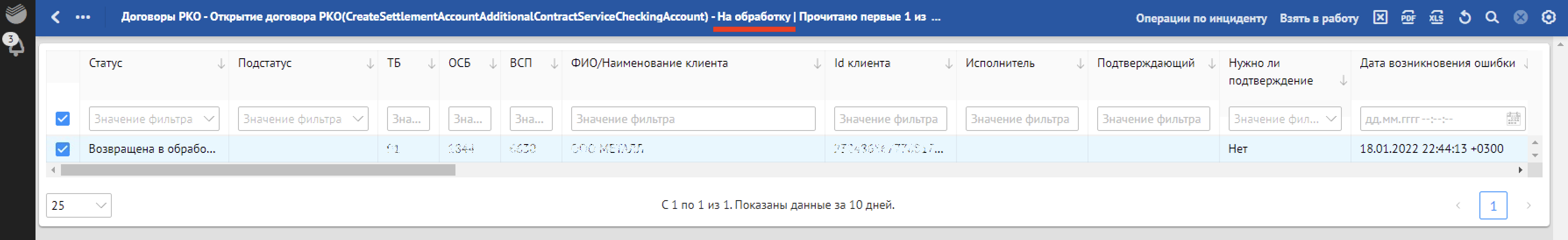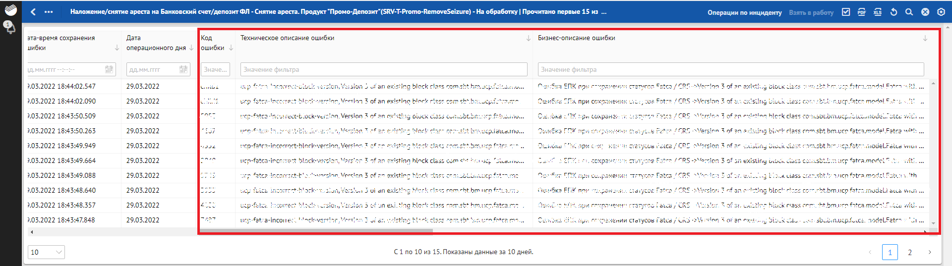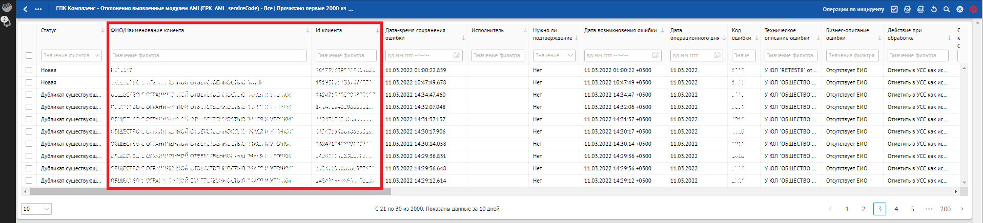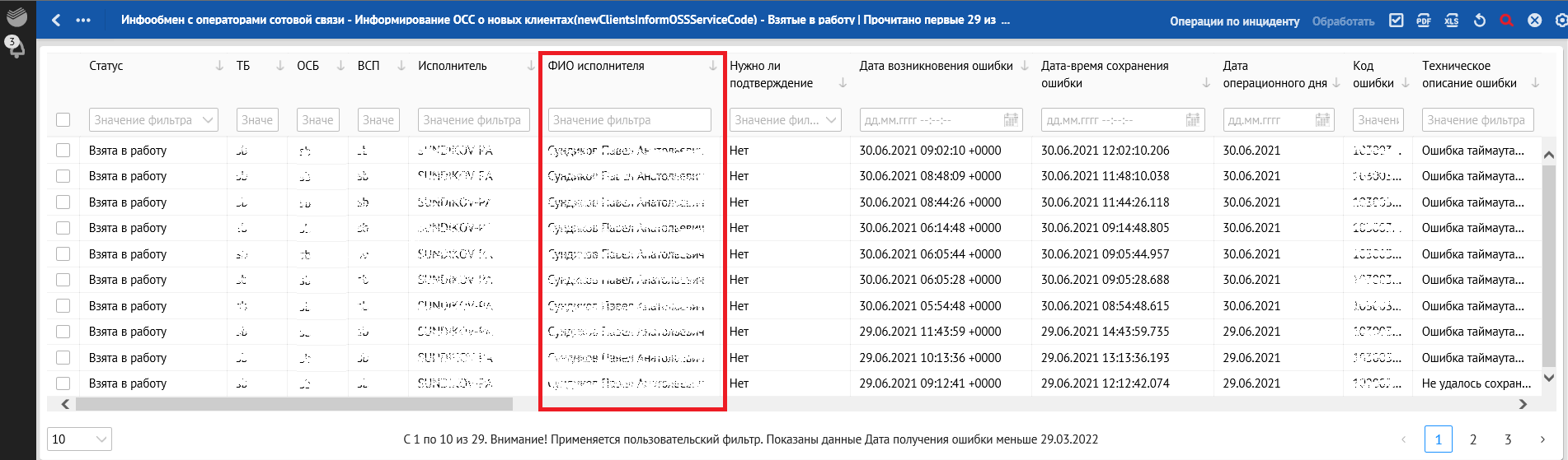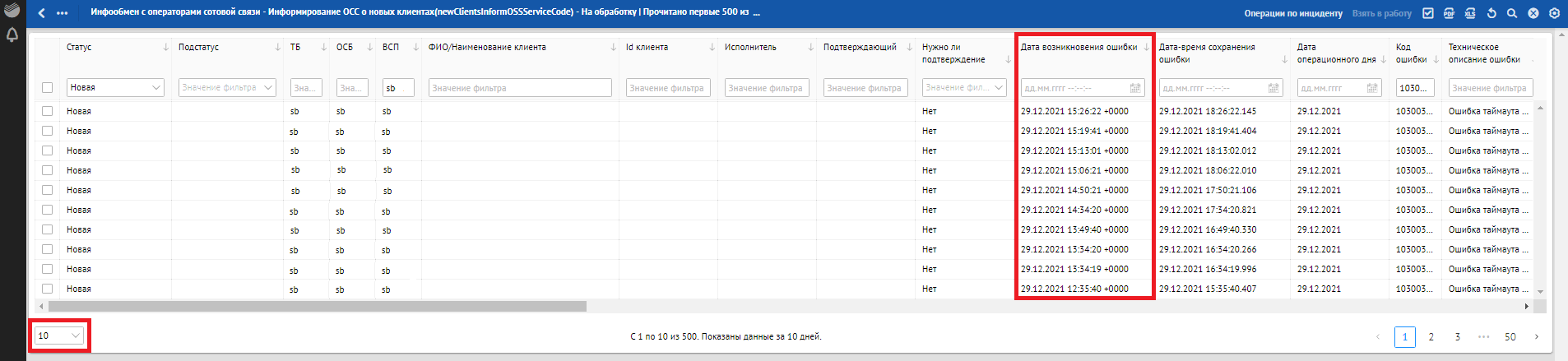 Кроме отклонений, отражающих в себе SLA о времени обработки, красным фоном также подсвечиваются отклонения, по которым произошли следующие ошибки обработки: