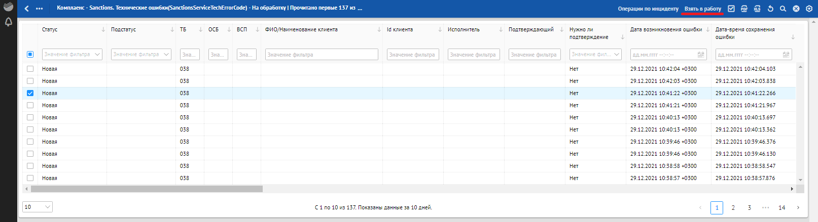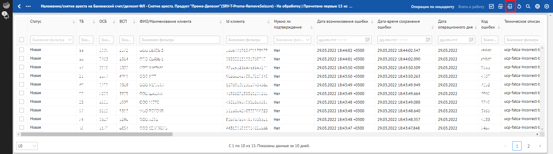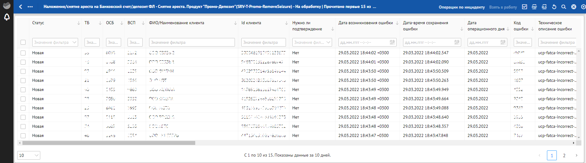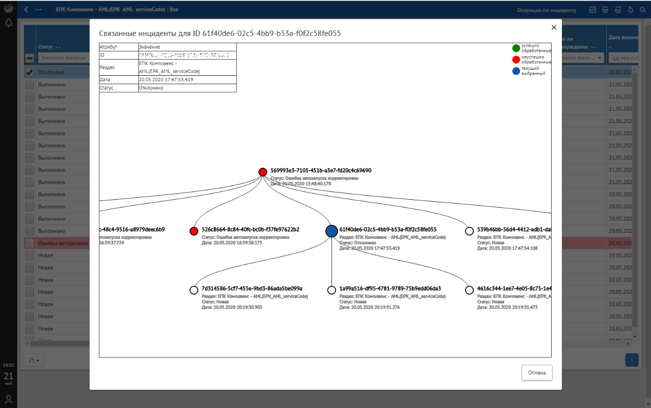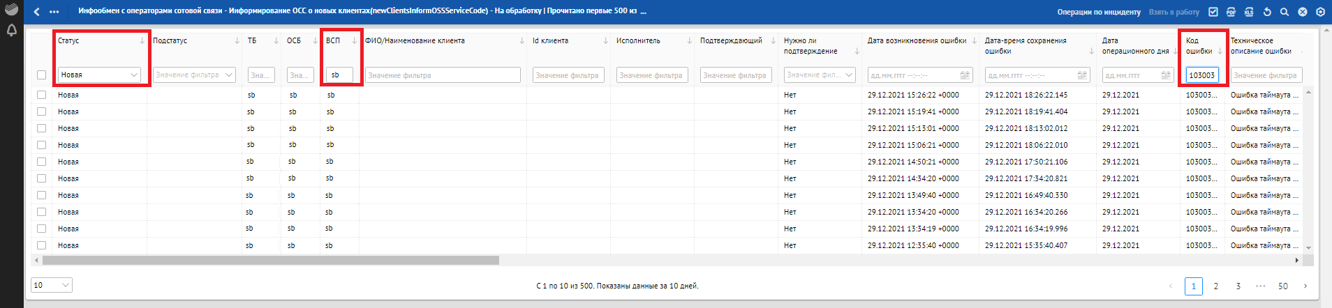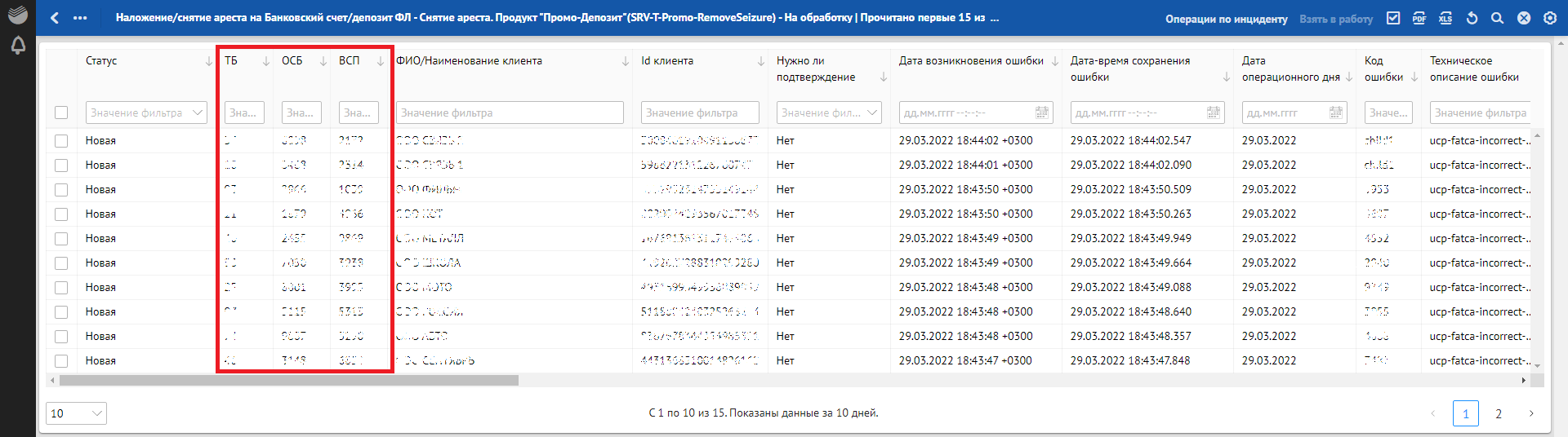 Кроме отклонений, отражающих в себе SLA о времени обработки, красным фоном также подсвечиваются отклонения, по которым произошли следующие ошибки обработки: