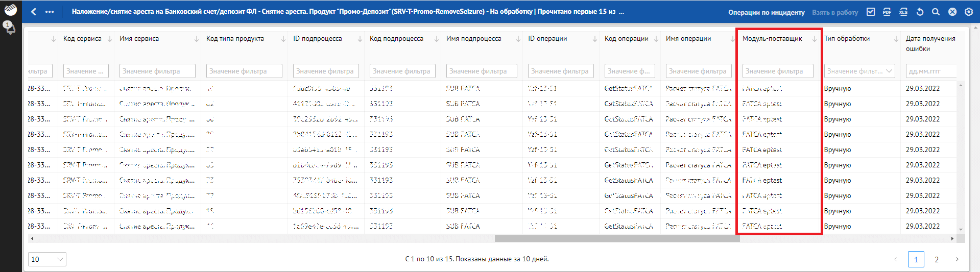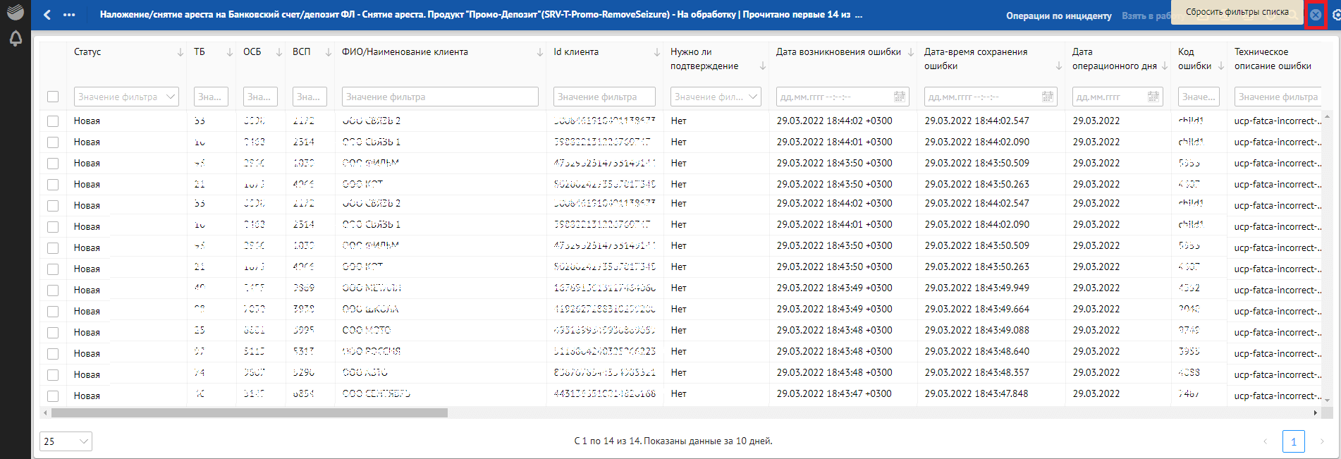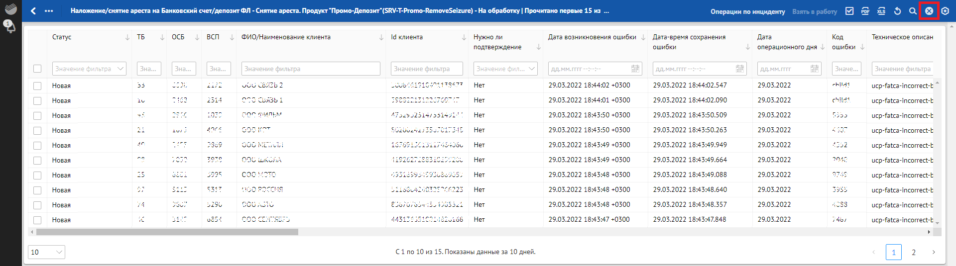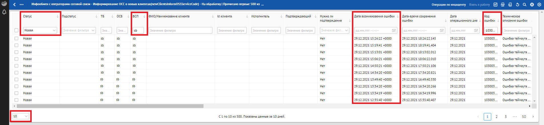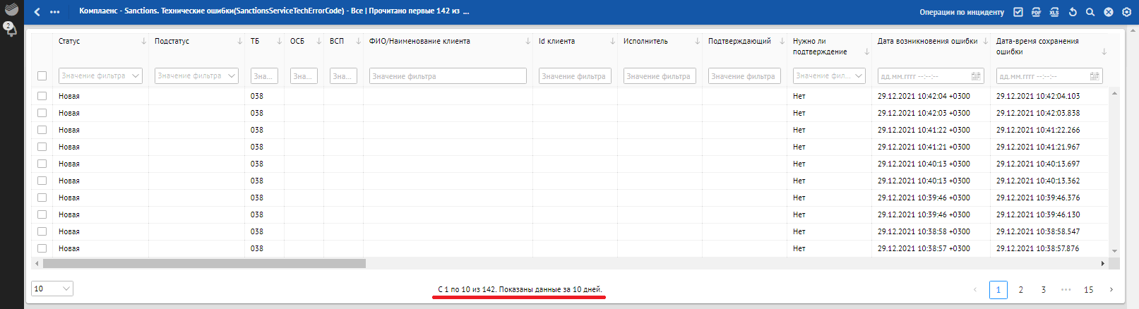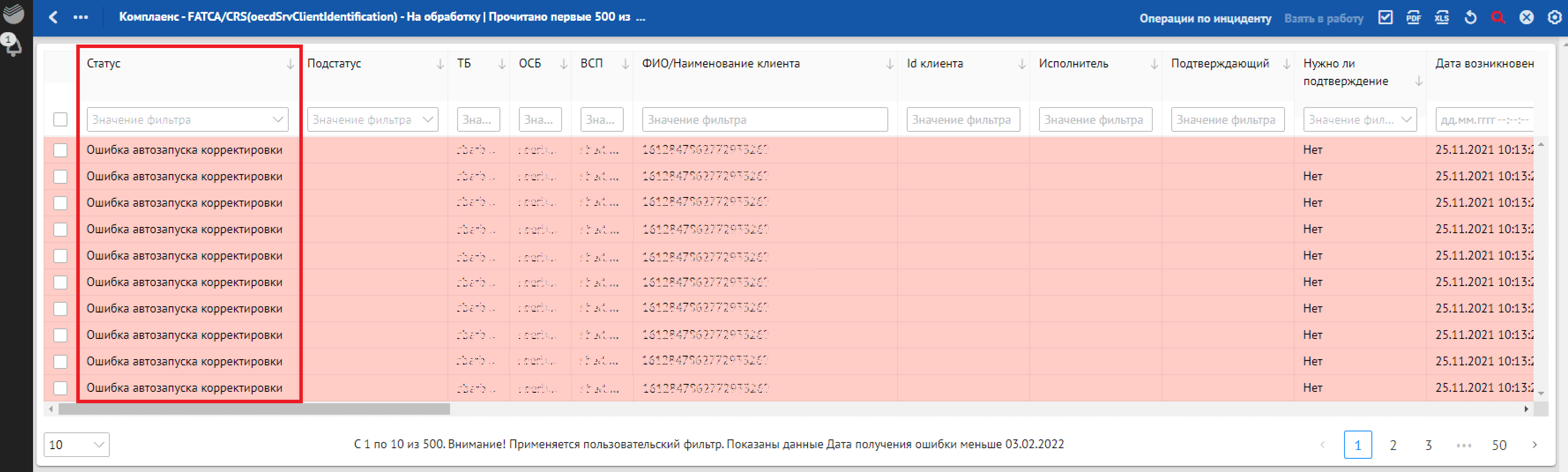 Кроме отклонений, отражающих в себе SLA о времени обработки, красным фоном также подсвечиваются отклонения, по которым произошли следующие ошибки обработки: