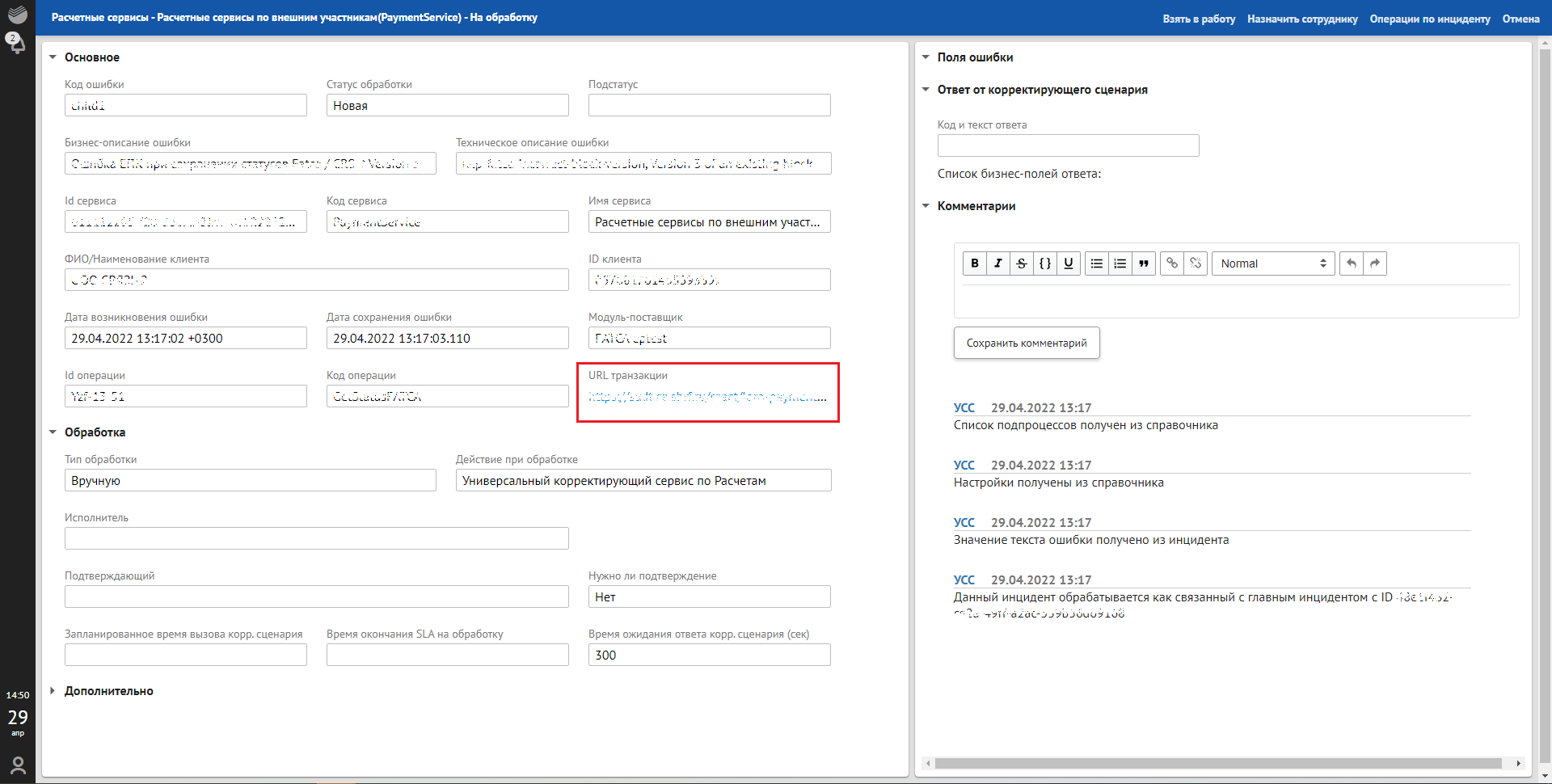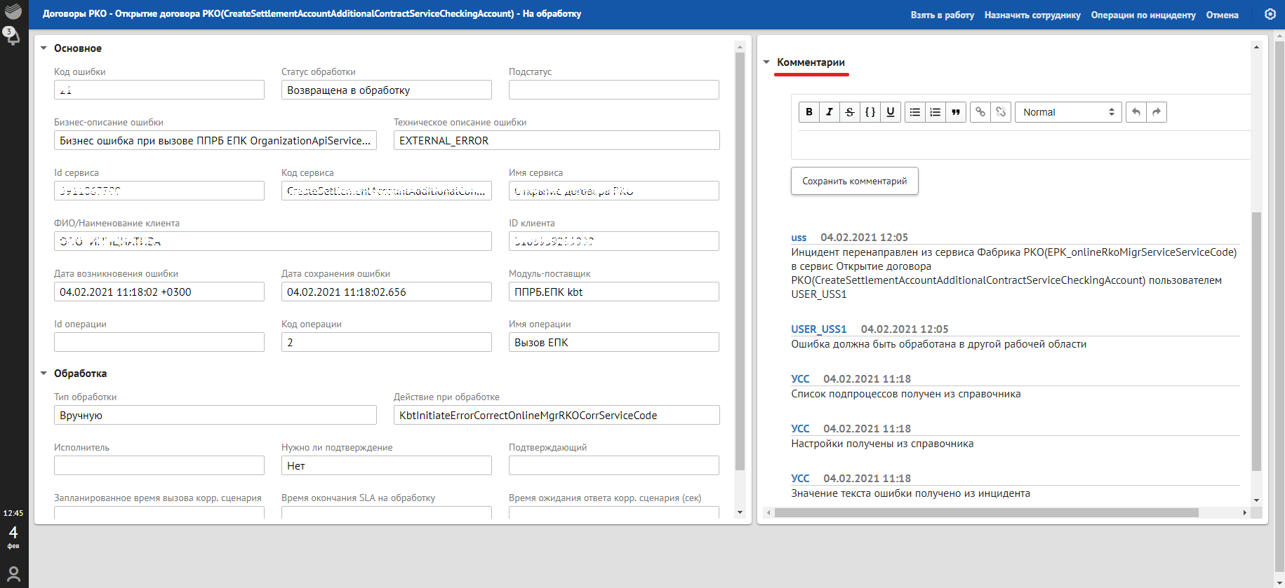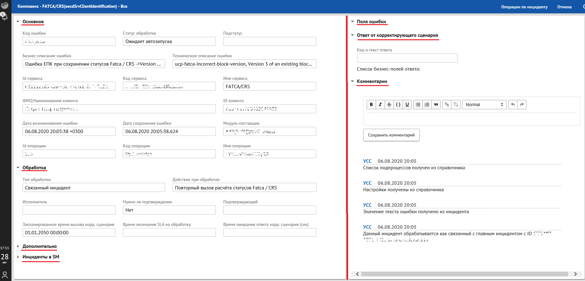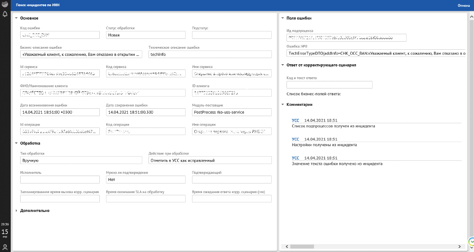 данные по инциденту (код сервиса, тип сервиса, наименование клиента, ID клиента);