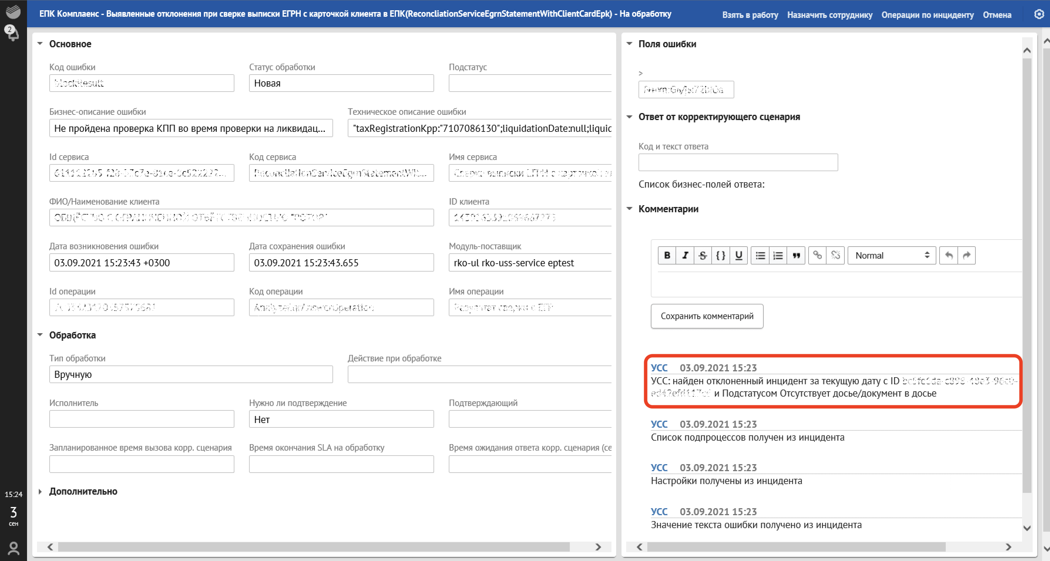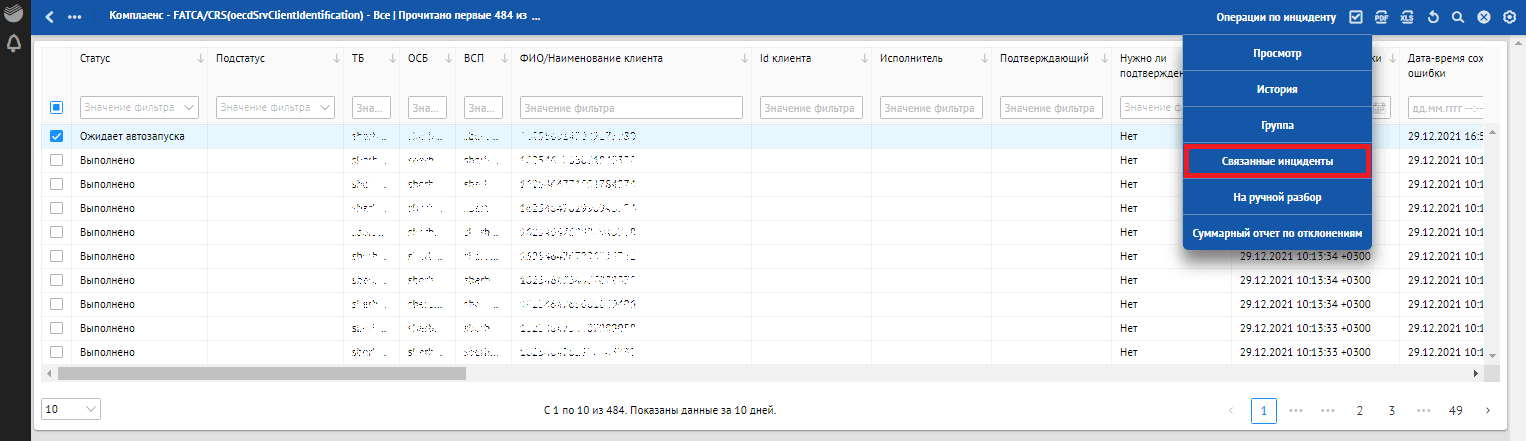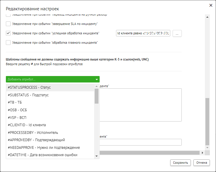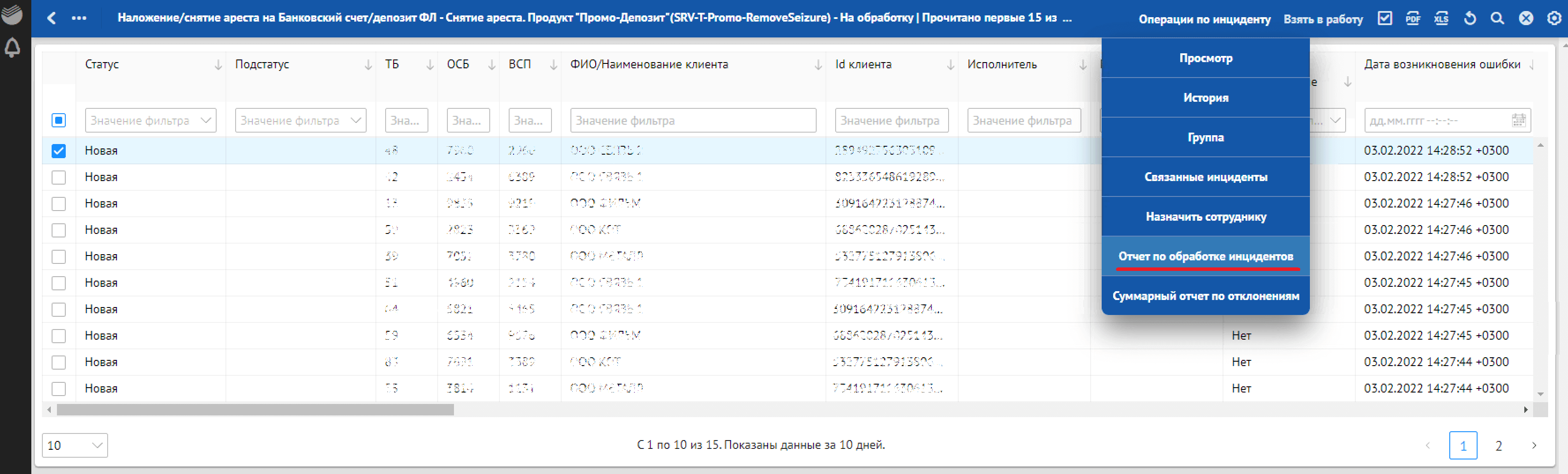 данные по инциденту (код сервиса, тип сервиса, наименование клиента, ID клиента);