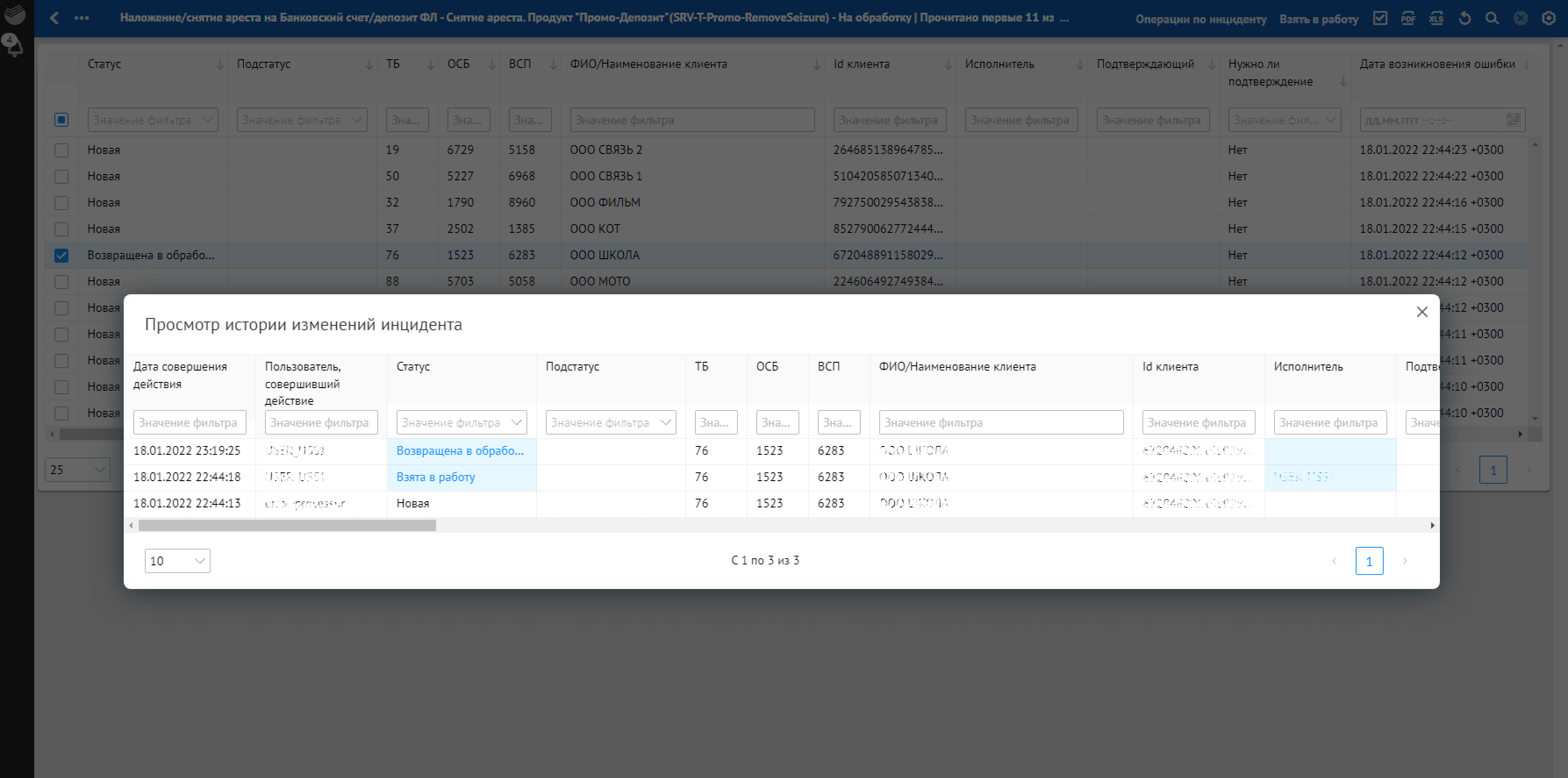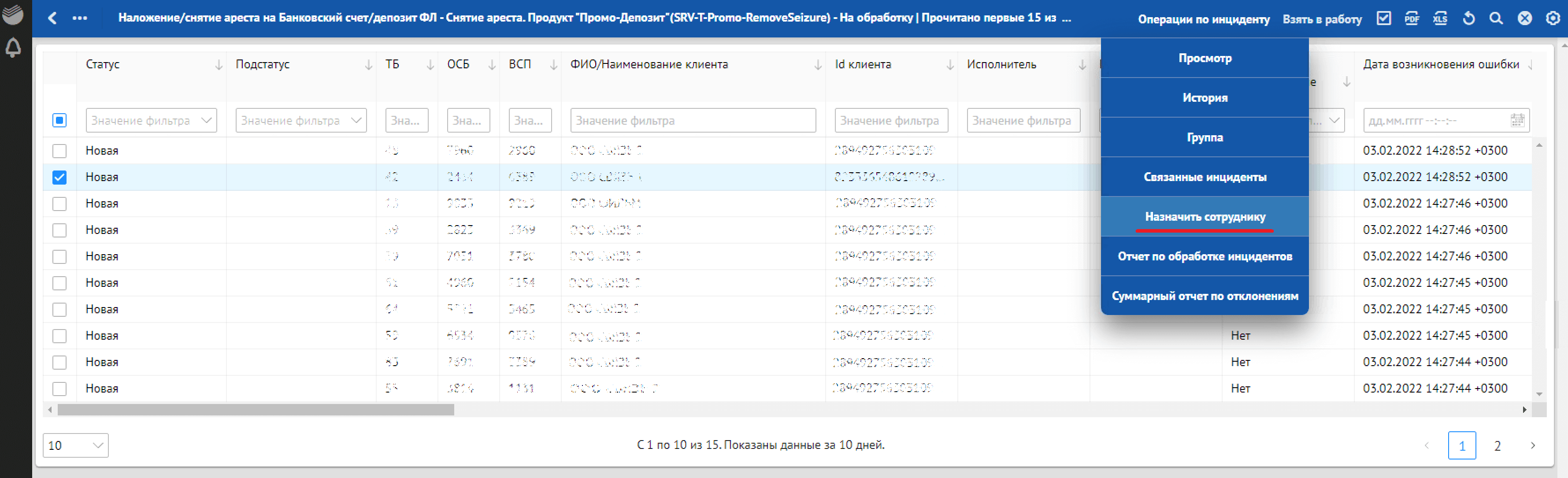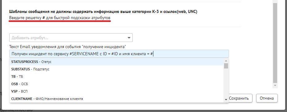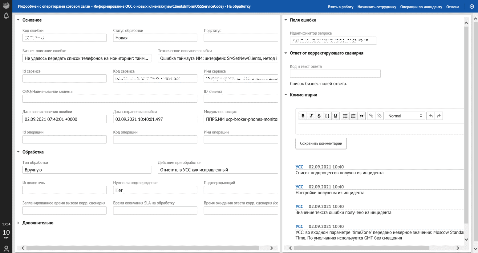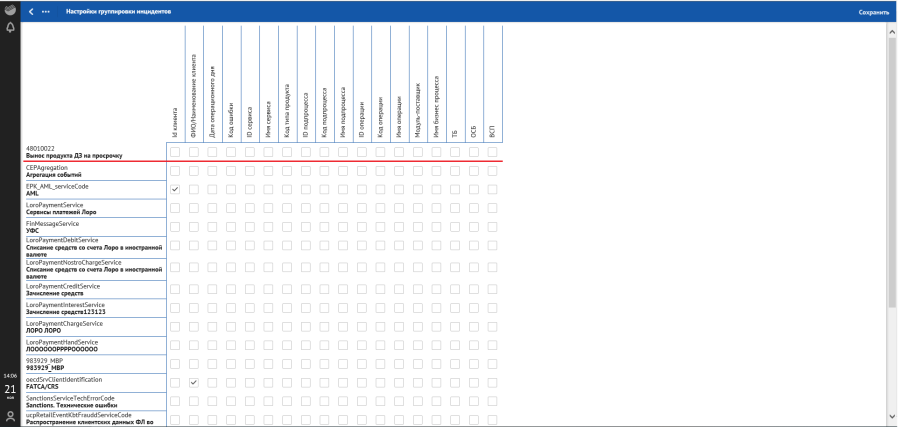 данные по инциденту (код сервиса, тип сервиса, наименование клиента, ID клиента);