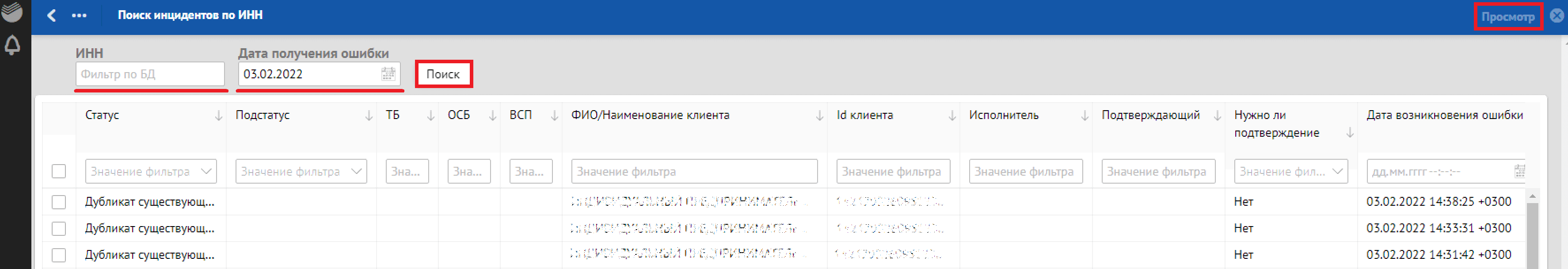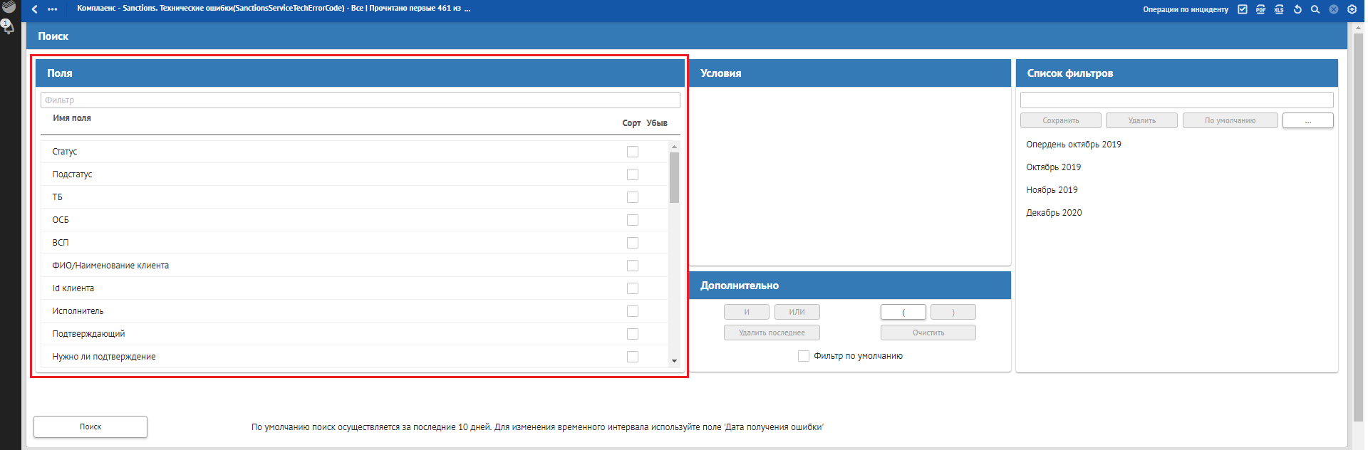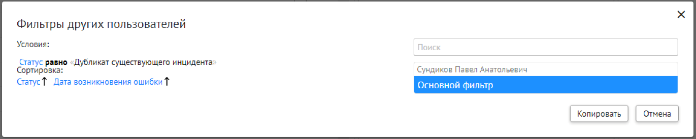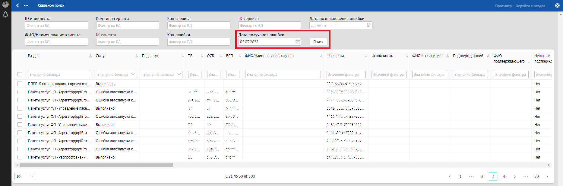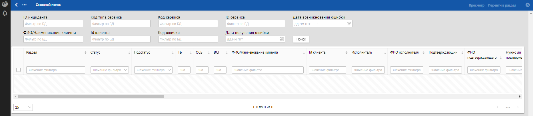 В окне «Сквозной поиск» ввести имеющийся критерий поиска, например, Дата получения ошибки. При указании нескольких критериев сквозной поиск осуществляется по всем заполненным критериям поиска.