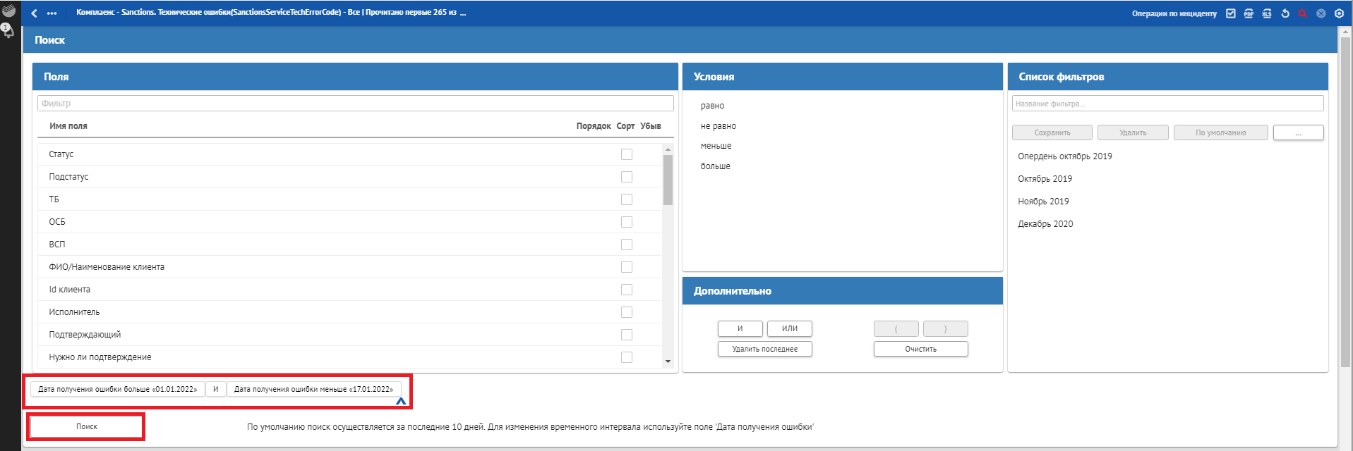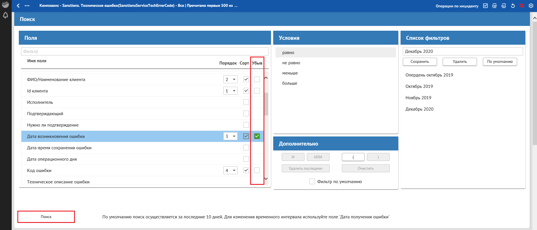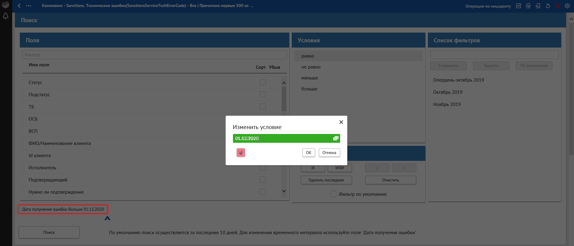 В окне «Сквозной поиск» ввести имеющийся критерий поиска, например, Дата получения ошибки. При указании нескольких критериев сквозной поиск осуществляется по всем заполненным критериям поиска.