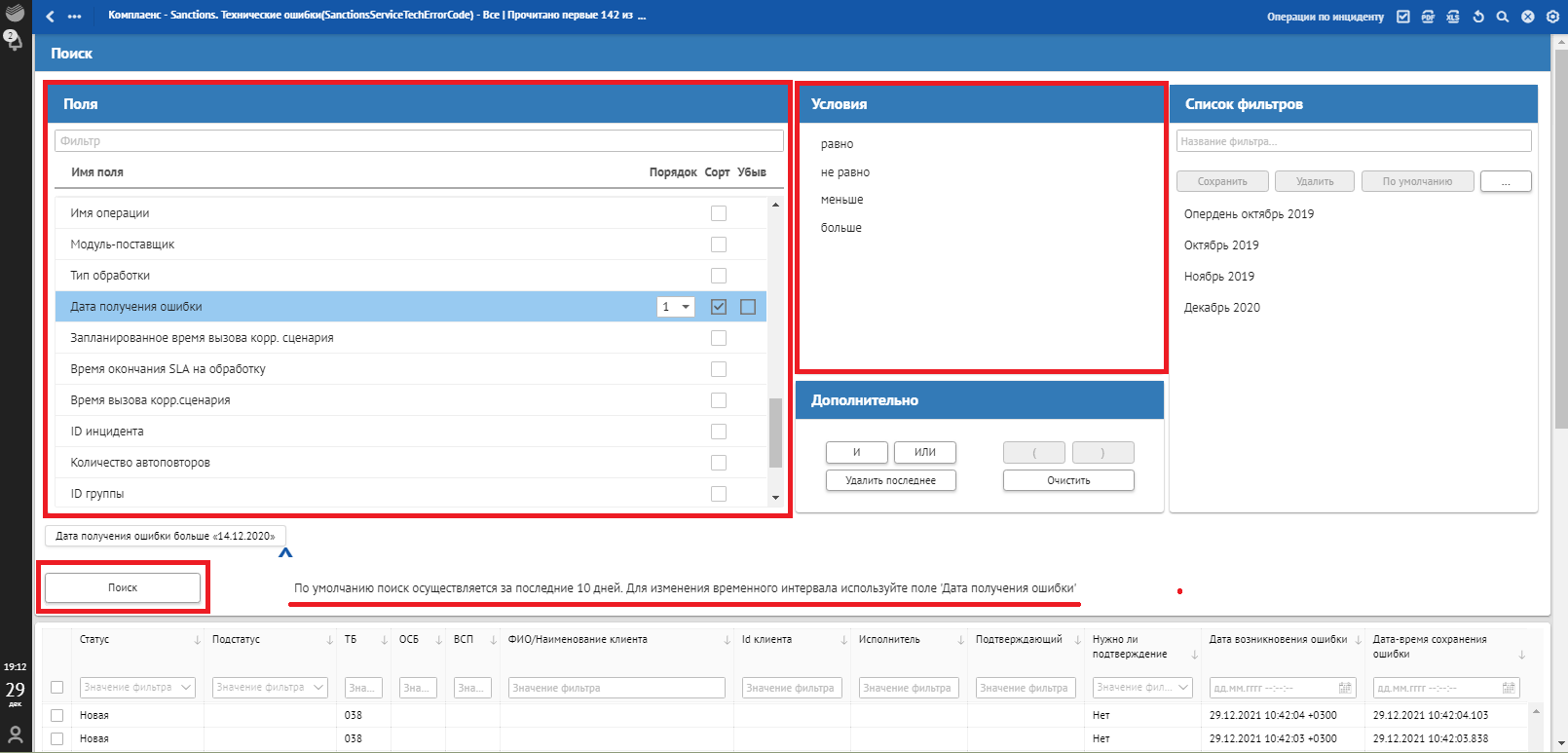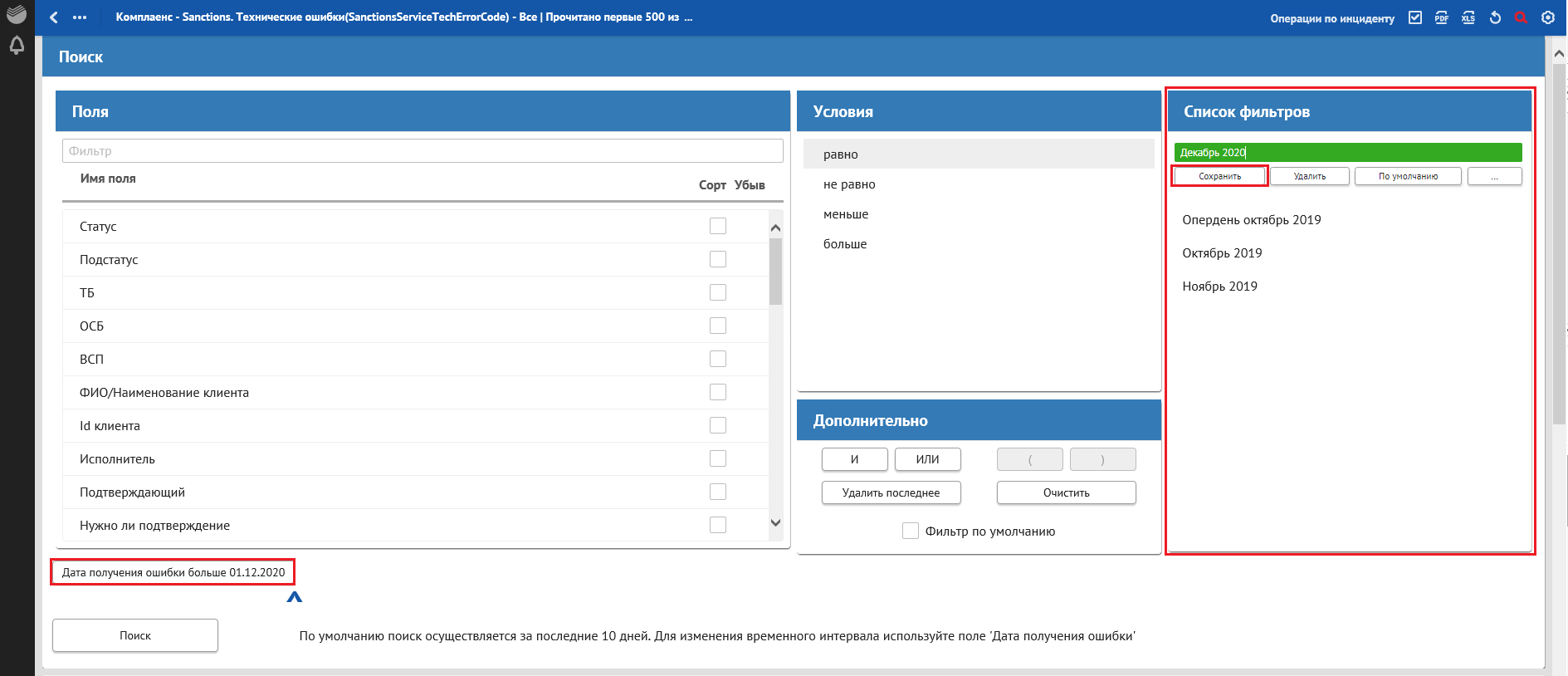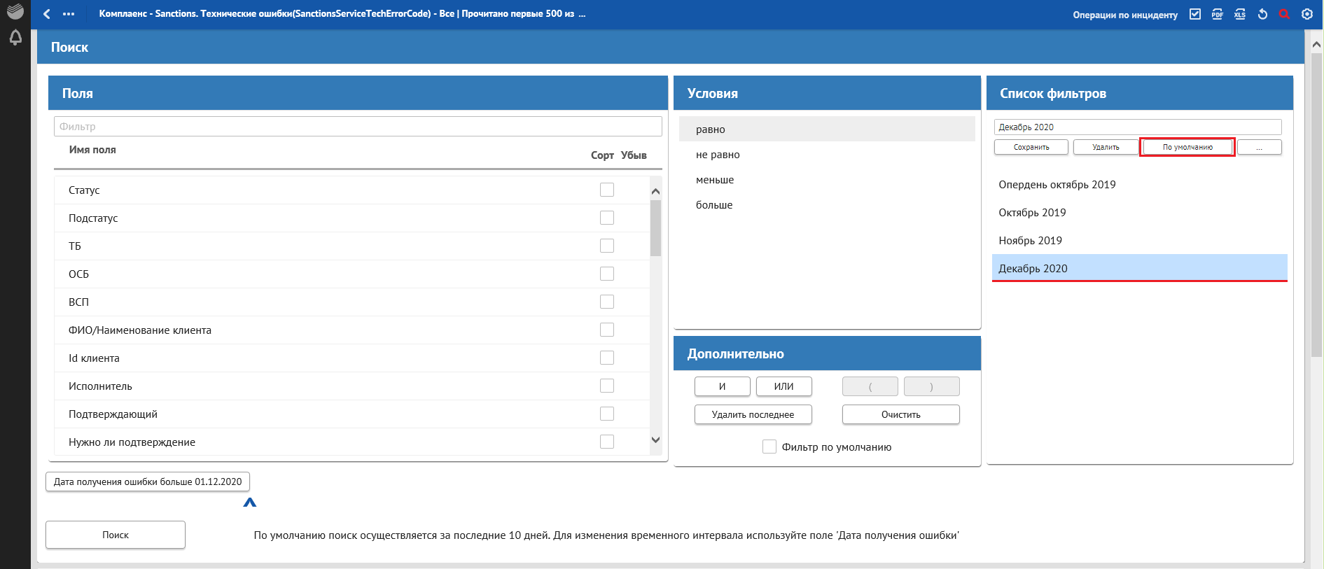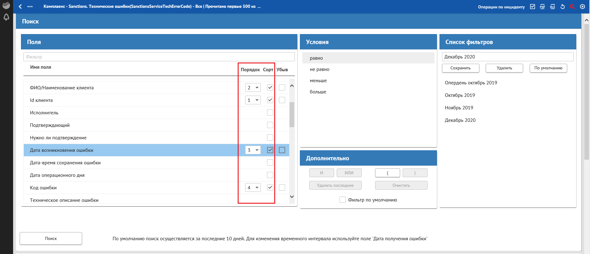 В окне «Сквозной поиск» ввести имеющийся критерий поиска, например, Дата получения ошибки. При указании нескольких критериев сквозной поиск осуществляется по всем заполненным критериям поиска.