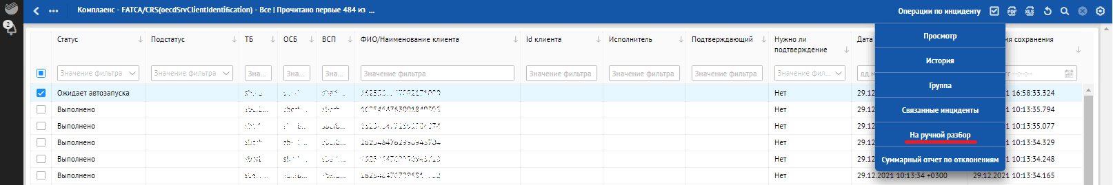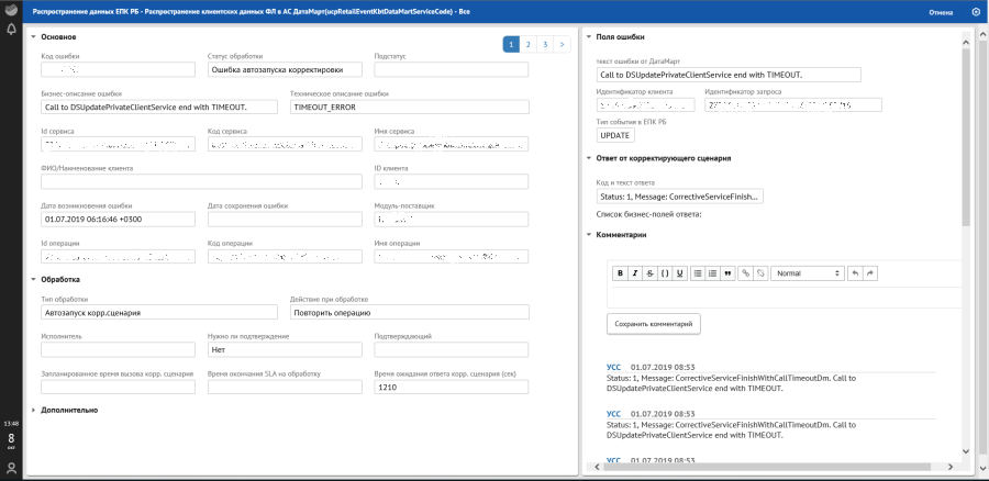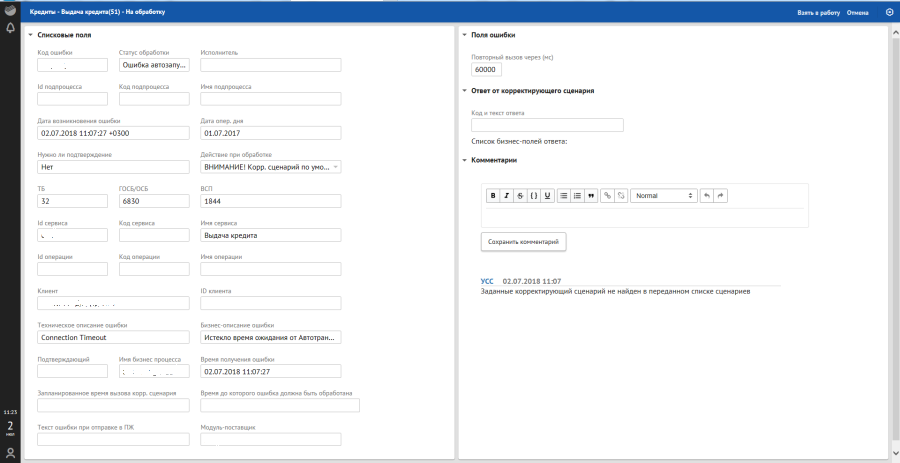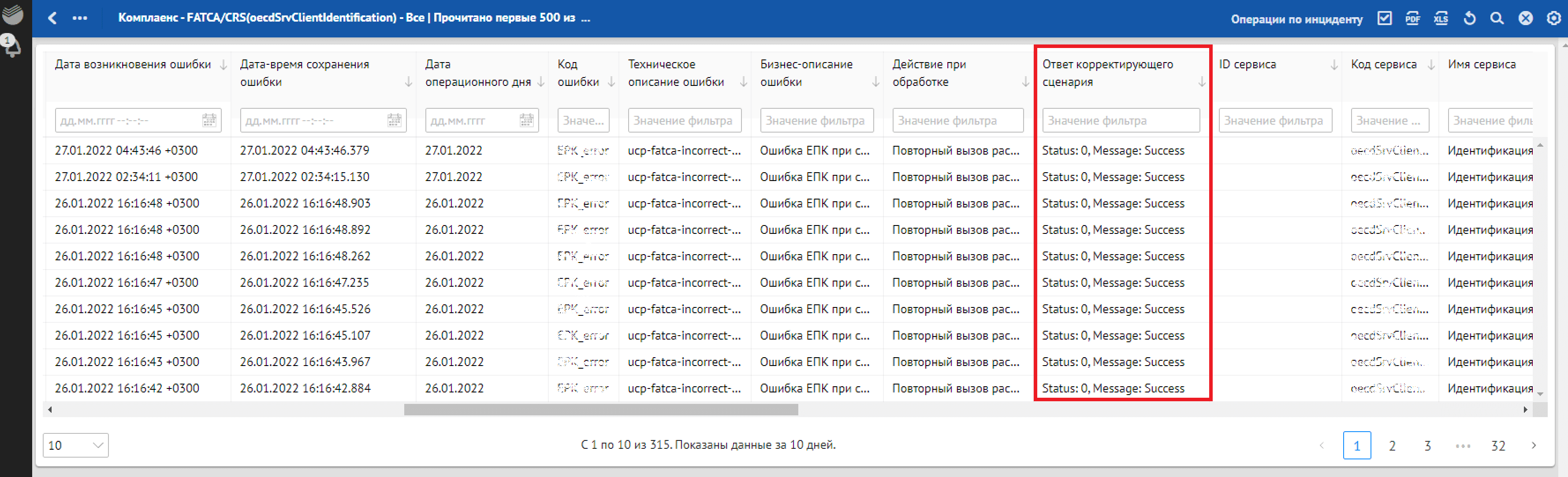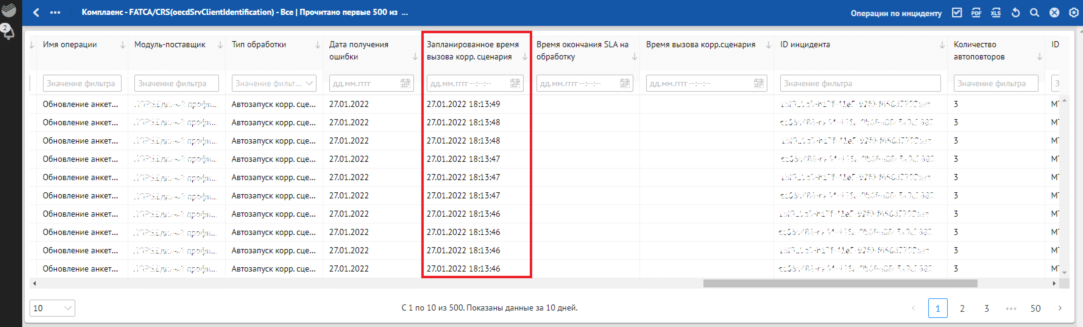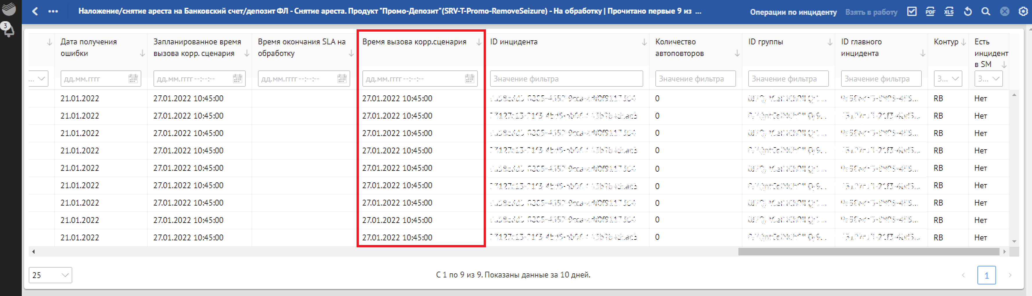 В отличие от цветовой подсветки SLA по отклонениям с ошибками запуска корректирующего сценария и ошибками корректировки в списковой форме прописывается «Статус» обработки отклонения: