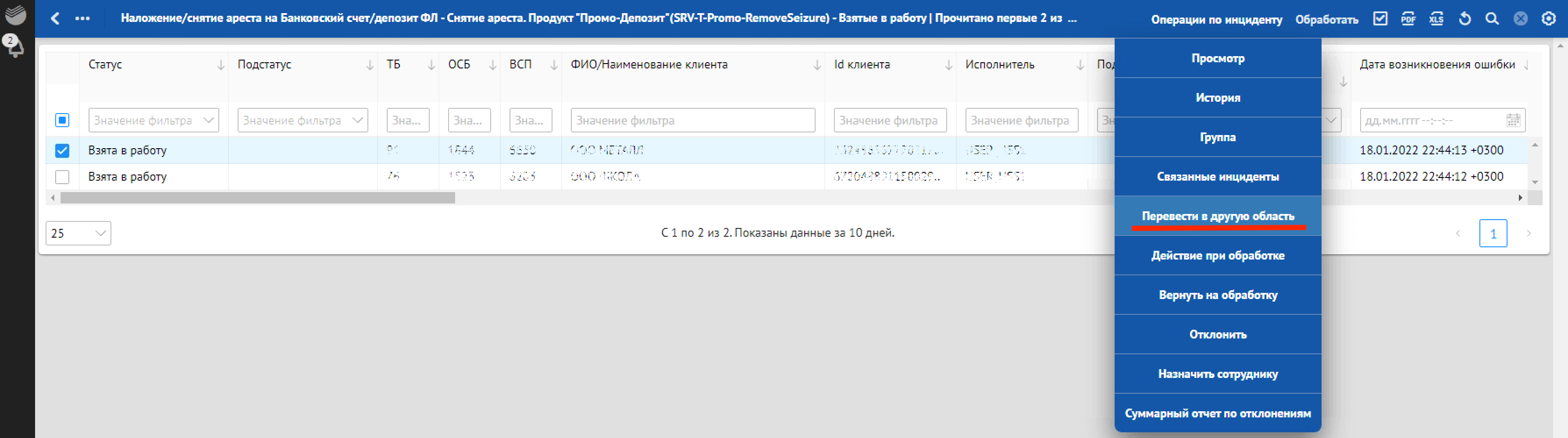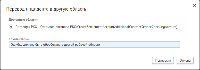 Действие «Перевод отклонения на следующую стадию обработки» зависит от того, в каком разделе открыта подробная форма инцидента: