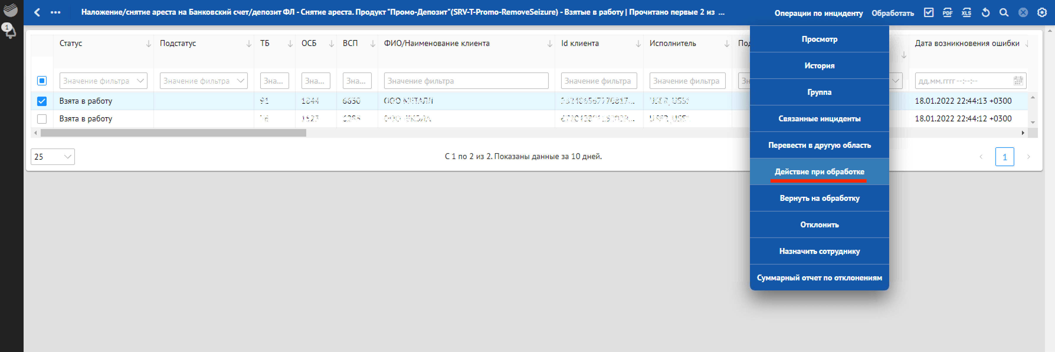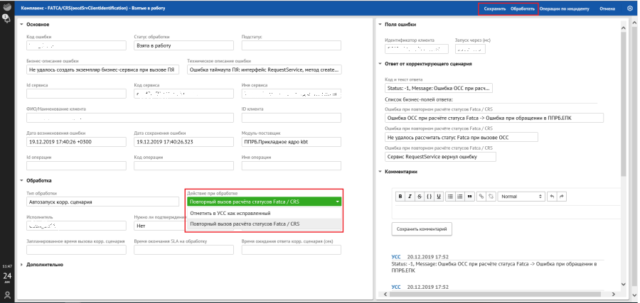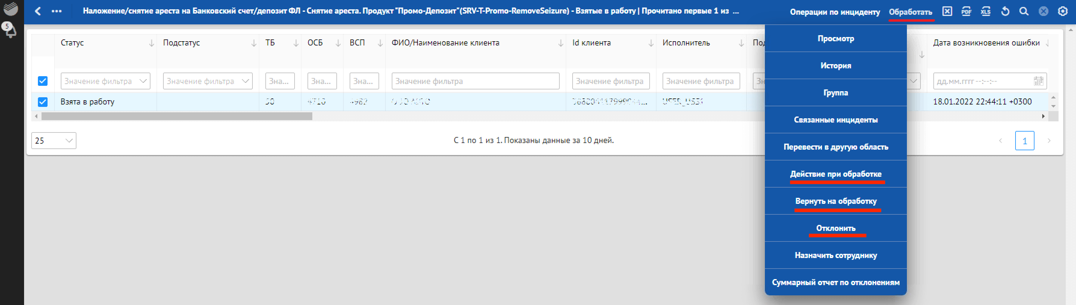 в разделе «Взятые в работу» — действие «Обработать»;