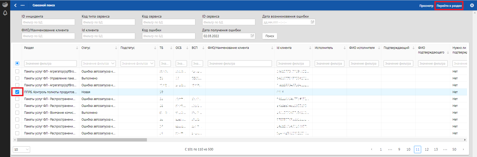 Кроме просмотра подробной информации по отклонению в разделе «Сквозной поиск» пользователь может посмотреть, в каком разделе Продукта находится данное отклонение, а также перейти в данный раздел для осуществления дальнейшей работы с данным отклонением. Для этого необходимо выбрать отклонение путем установки флага в столбце «Чекбокс», после чего нажать кнопку Перейти в раздел.