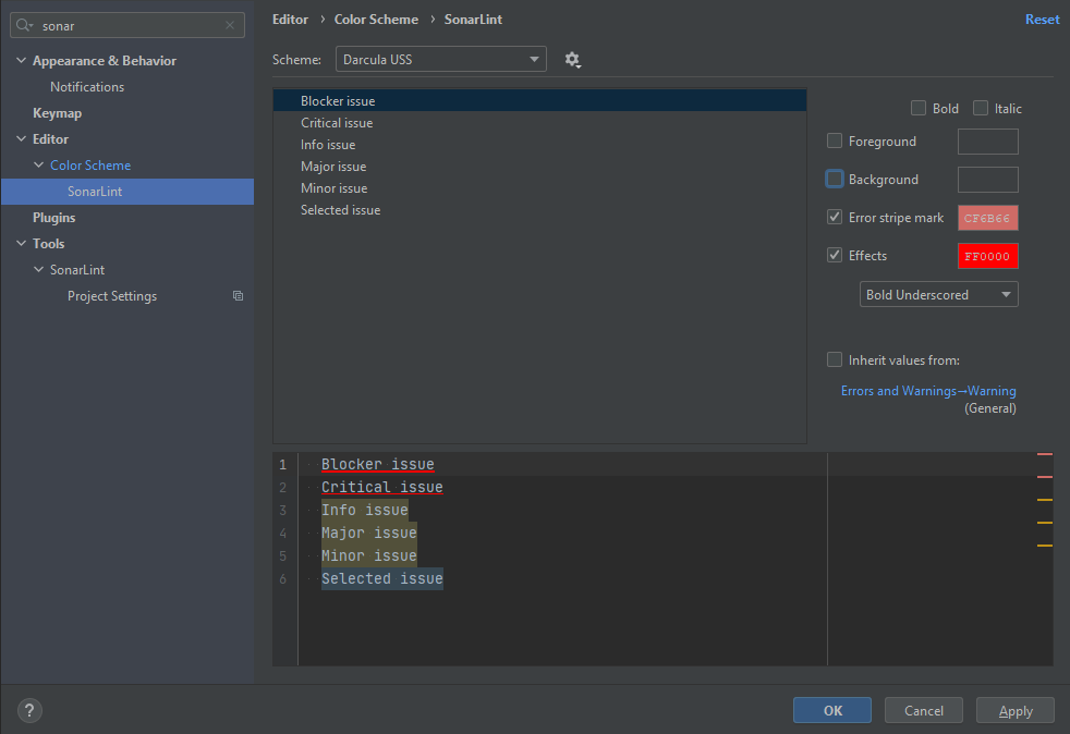 Код должен соответствовать требованиям SonarQube. SonarQube анализирует общее качество кода, ошибки высвечиваются при нарушении основных правил (например, дублирование кода или заведомо очевидные уязвимые места). Не должно быть критических и блокирующих замечаний. Для упрощения контроля необходимо установить плагин SonarQube. После установки его необходимо настроить для подключения к SonarQube и изменить отображение ошибок как на рисунках ниже: