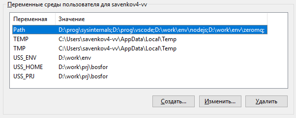 Далее необходимо дополнить пользовательскую переменную Path значением D:\work\env\nodejs.