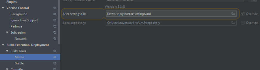 В настройках интегрированной среды разработки необходимо указать путь к проектному файлу settings.xml (находится в корневой папке проекта).