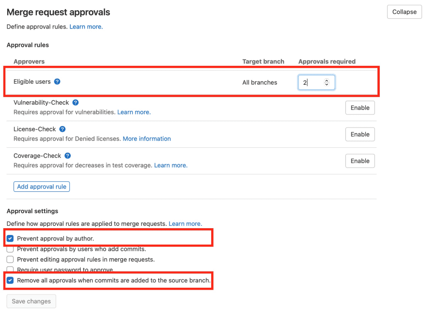 Настройте Approval settings: Prevent approval by author и Remove all approvals when commits are added to the source branch. Эти флаги при включении и выключении обеспечивают следующий функционал: