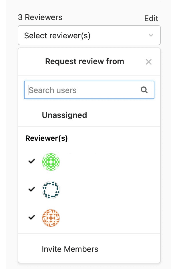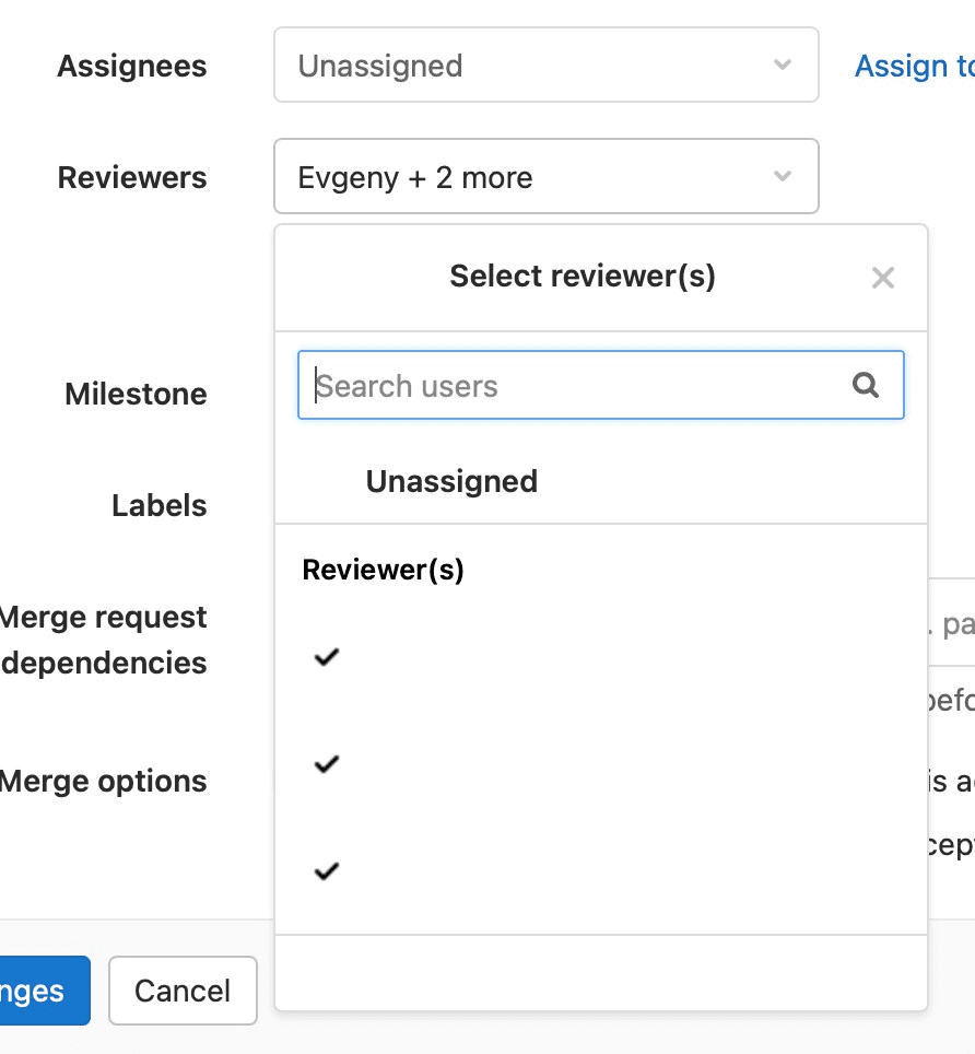 На странице просмотра запроса на слияние можно увидеть и отредактировать список рецензентов в правой боковой панели в блоке Reviewers. Для этого нажмите кнопку Edit и внесите изменения: