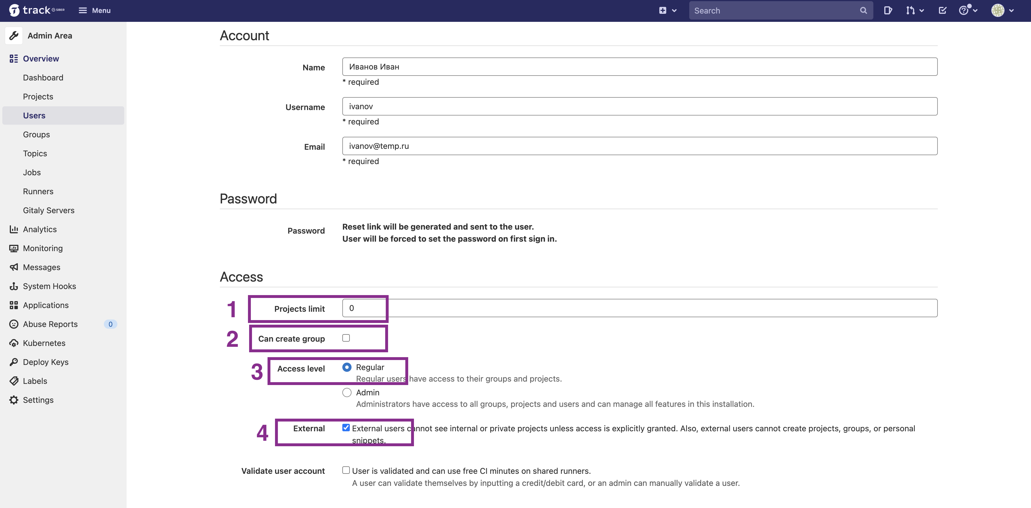 На странице создания нового пользователя заполните поля Name, Username и Email и проставьте настройки в блоке Access: